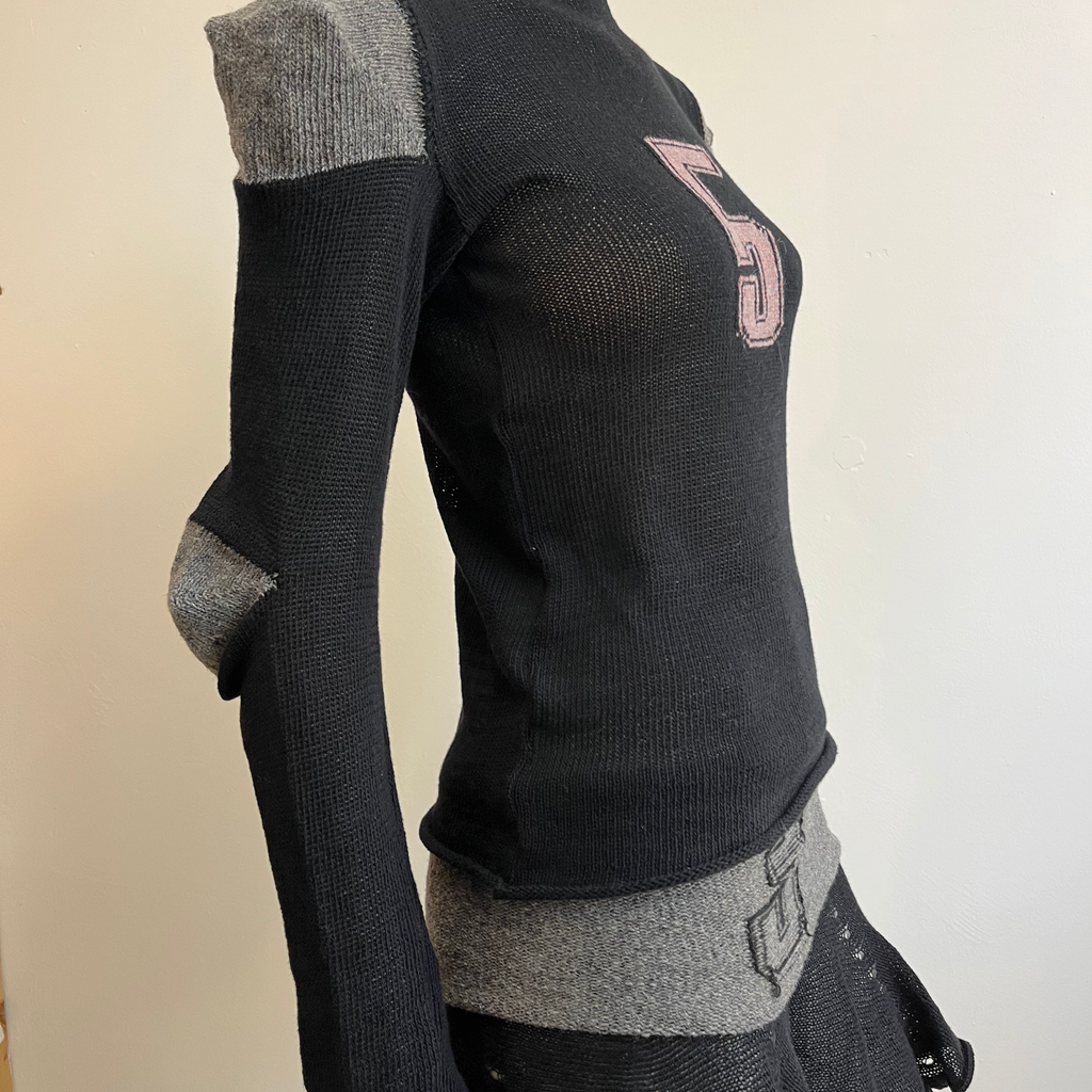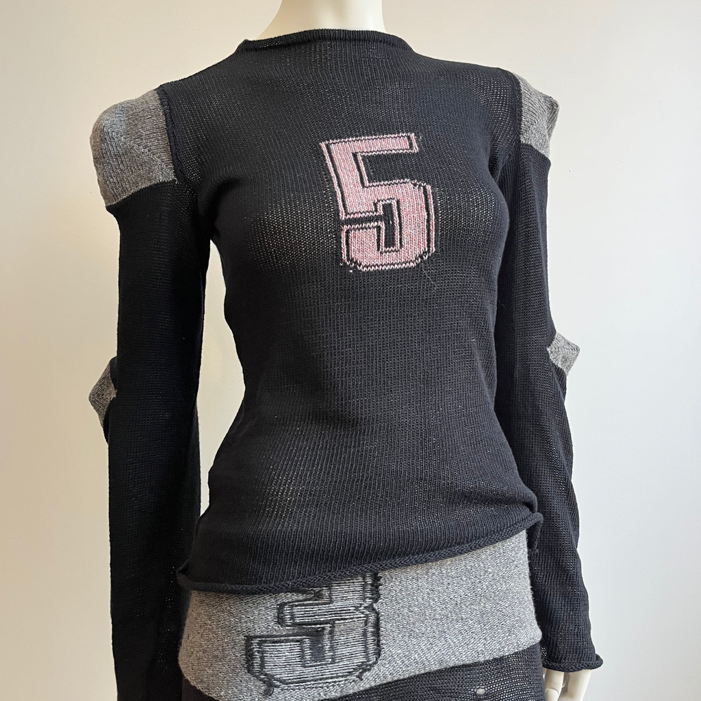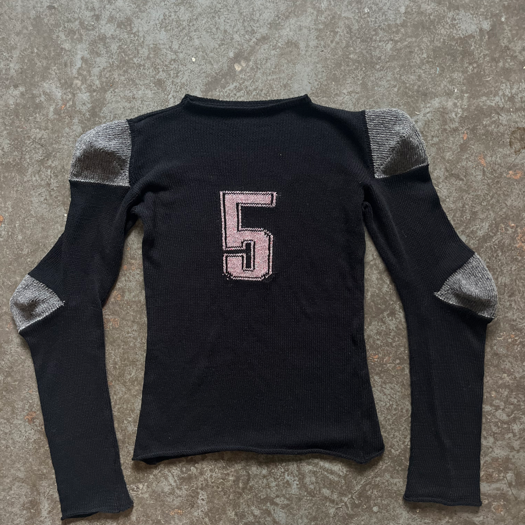 Soft cotton long sleeve knit featuring structured shoulder and elbow shaping and number graphic in the middle.