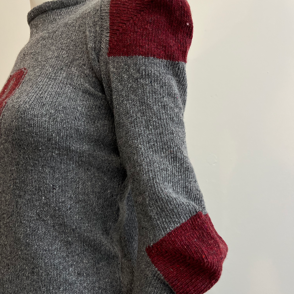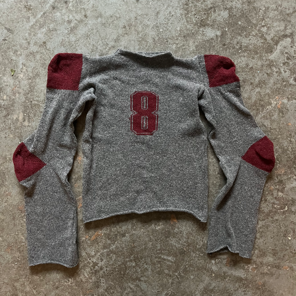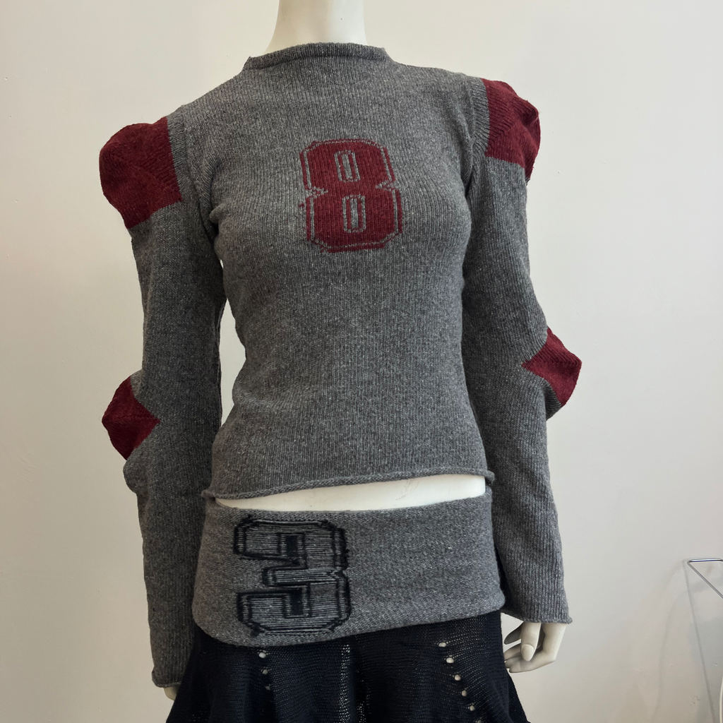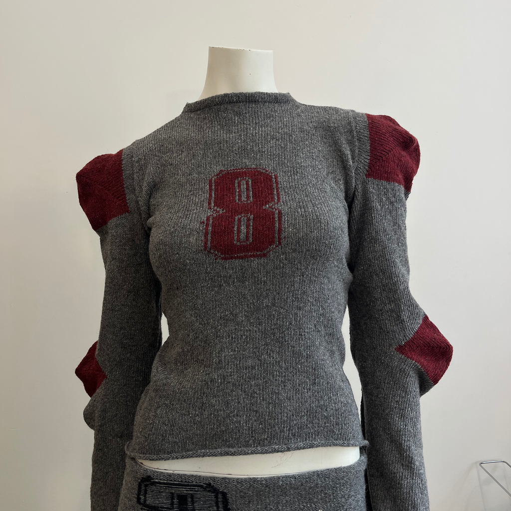 Recycled wool knit jumper featuring structured shoulder and elbow shaping and number graphic in the middle