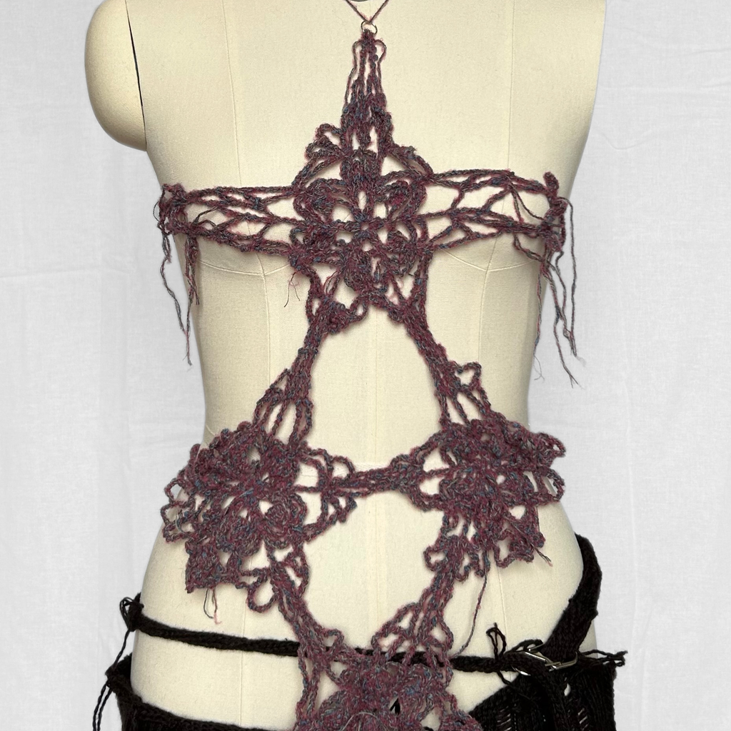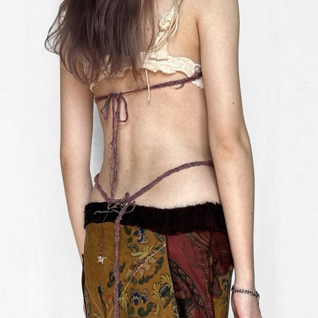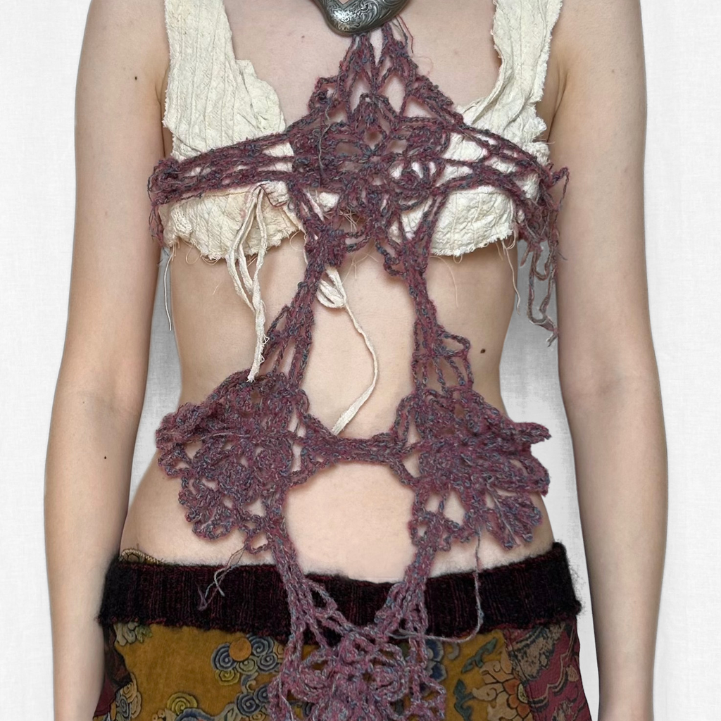 Chinese-born Madeline Hing started her brand ssdslsns in September 2021. Specialising in unique knitwear, textile manipulation, and intricate designs, she manages the entire process from research to fabrication. Some of her delicate pieces include the 'Handle with Love' crochet top, 'Open My Heart' knitted metal bag, and patchwork 'Stitched Remains' skirt. Hing believes that clothing is an extension of our body, and she hopes that the wearer can create special memories with her garments.