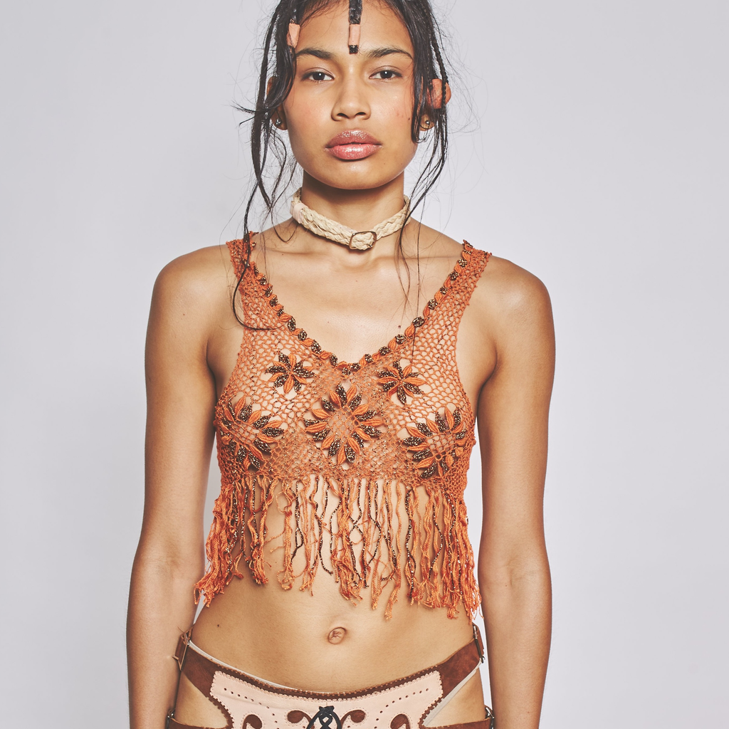 Handmade bobbin lace tank in bamboo and lurex fibres. Produced with lacemaker artisans in northern Brazil.