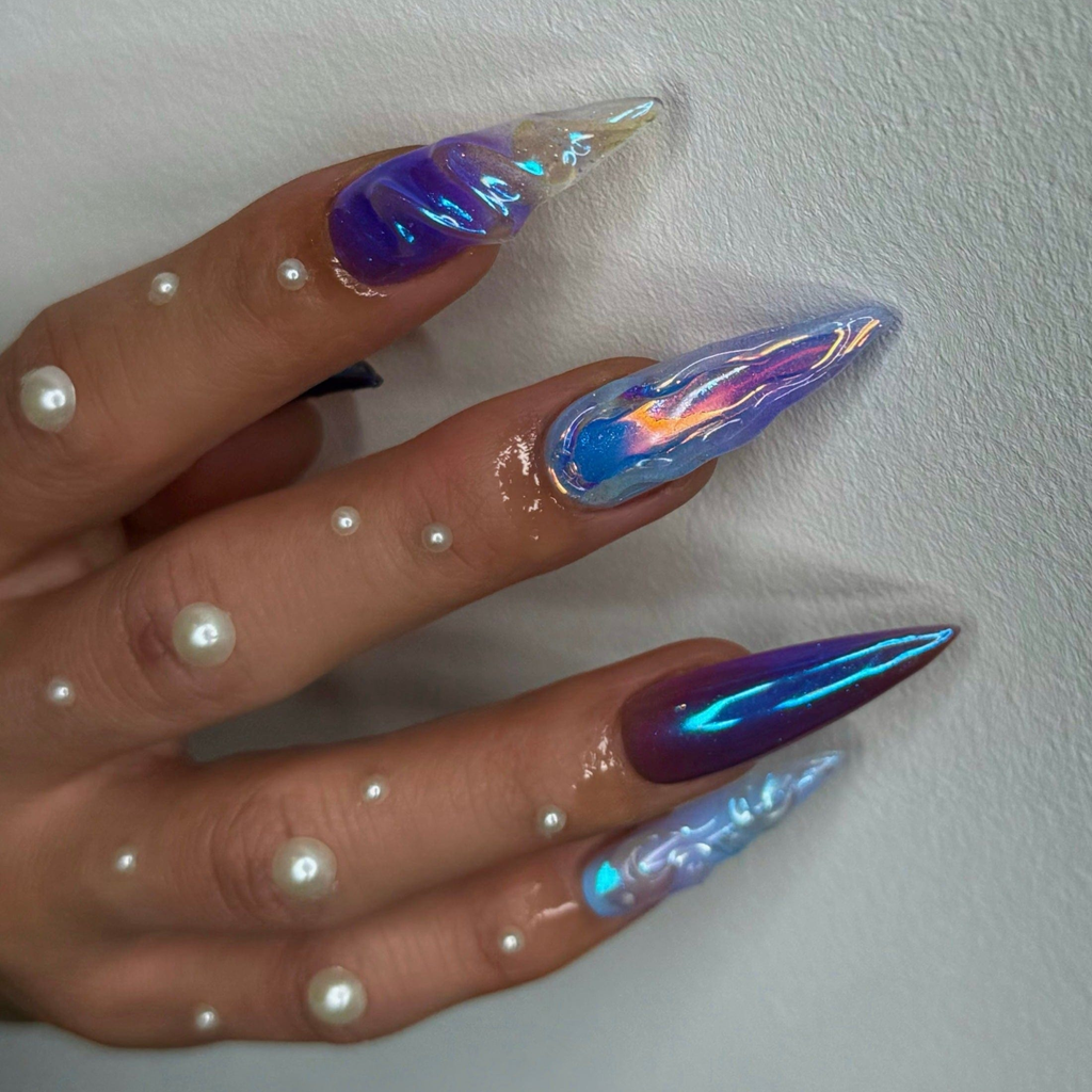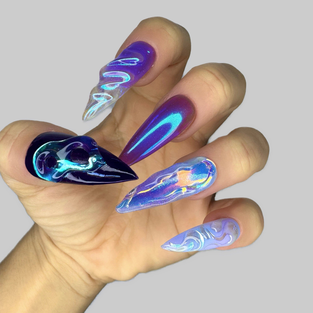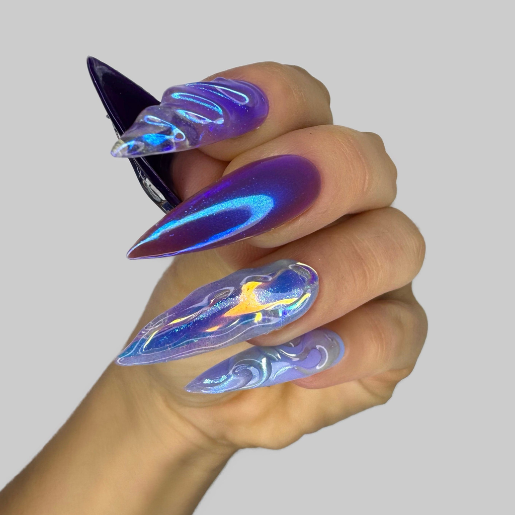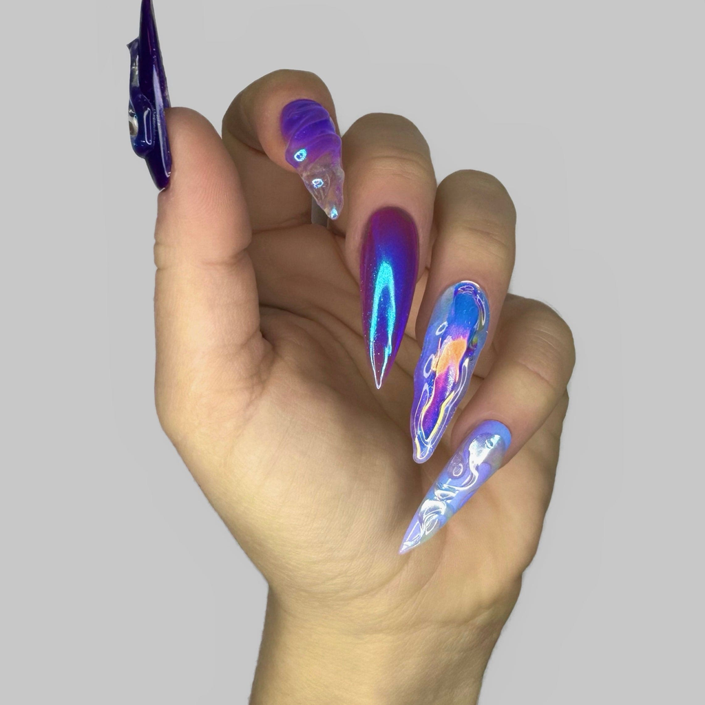 Set 4: « Galactic » is a mix and match of 10 piece set of press-on nails playing with icy reflections and texture. Each set is made custom to your nail sizes. The shape and length of the tips can be modified according to your preferences. A sizing kit will be provided to you after making the purchase. Press-on made from Gel-X tips. Made by hand in France.