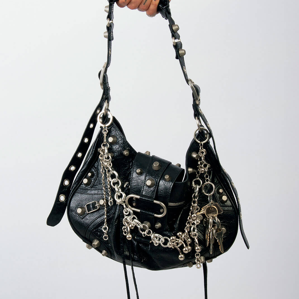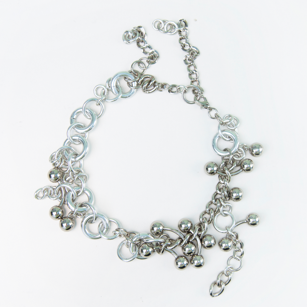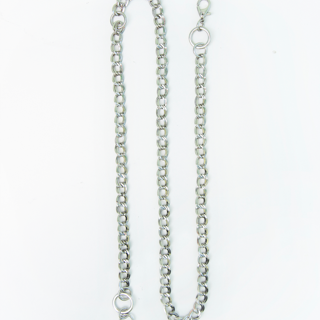 One size, adjustable. It comes with different extensions and can be used as a choker, a necklace, a body chain or a bag accessory.