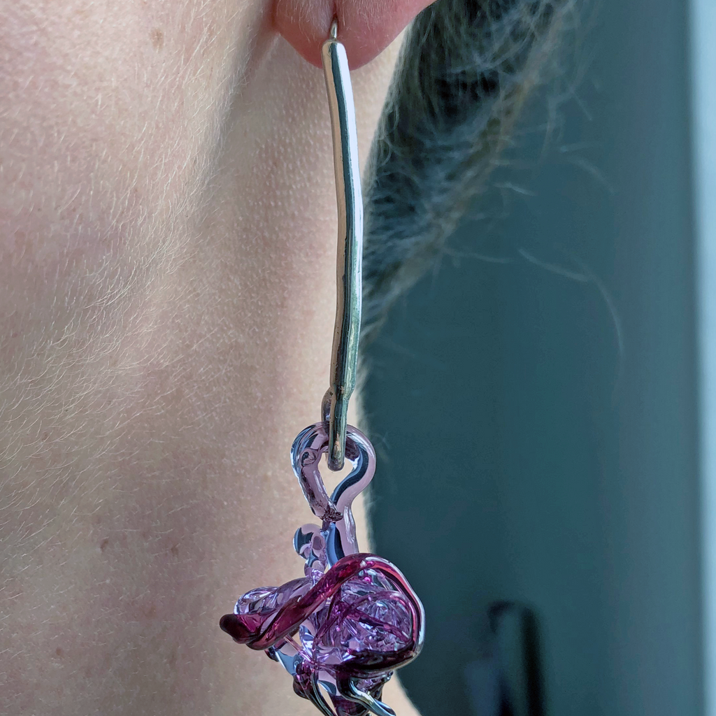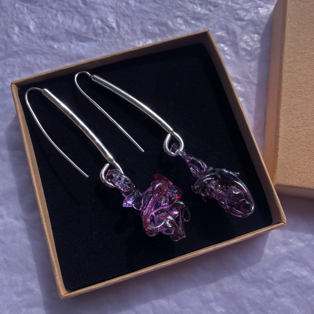 These earrings are handmade with glass changes color in the light, from pink to purple. This piece comes in a purple and pink/metallic color.