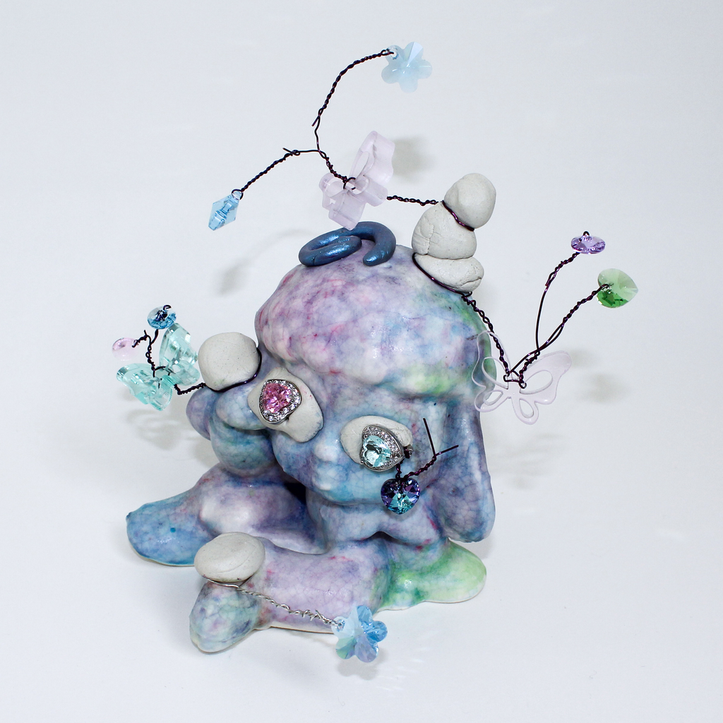 Emma Pryde is an artist and jewelry designer based in Los Angeles. Her work combines visual motifs from various time periods to produce hybrid, shimmering objects that embody the idea that the digital world collapses history. Inspired by childhood toys, mythical creatures, video game characters, and ancient artworks, she synthesizes her references to create new artifacts from alternate worlds. Her work is composed out of a variety of materials including ceramic, cast porcelain, epoxy, laser-cut acrylic, and other mixed media.