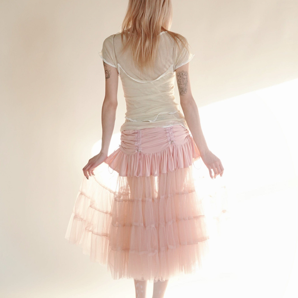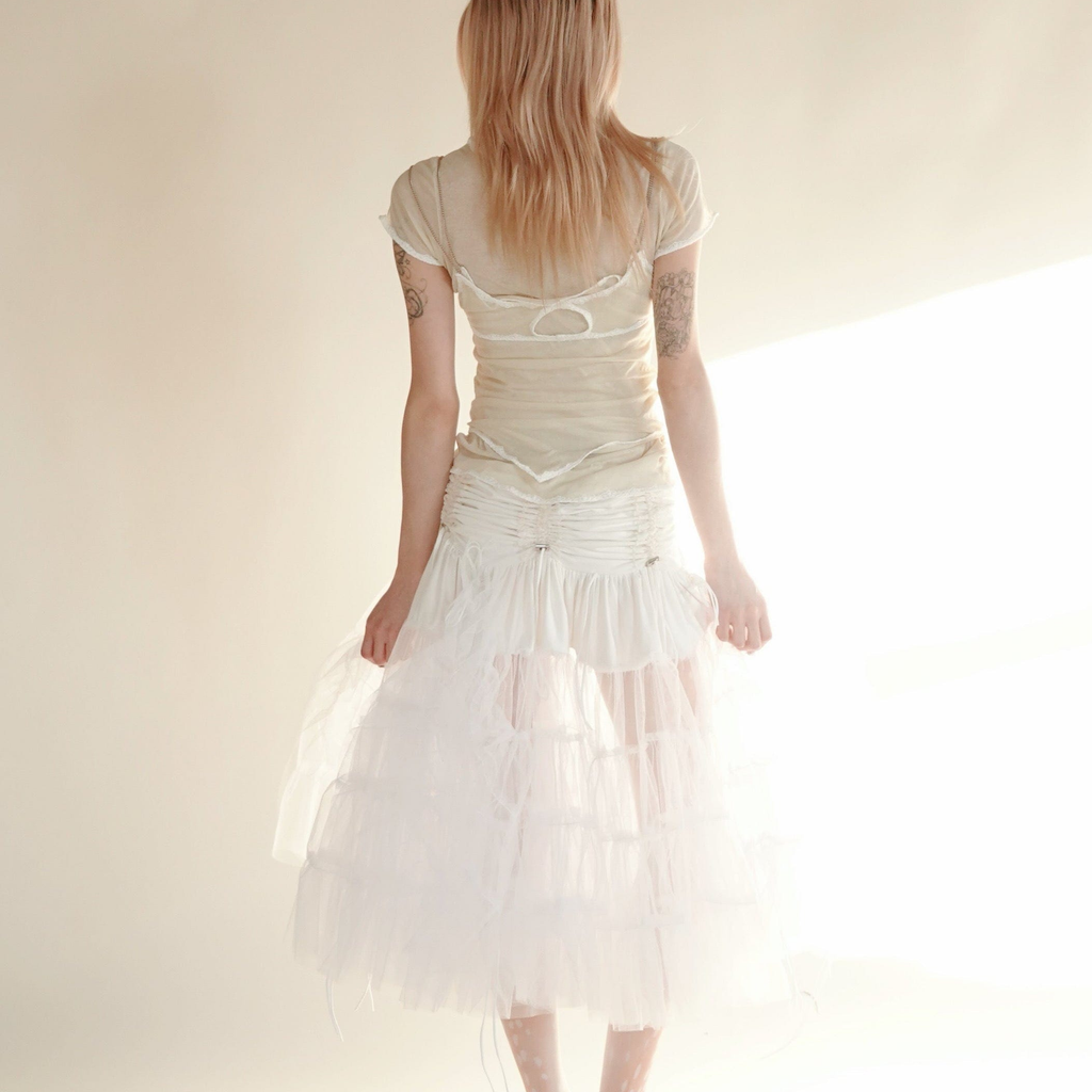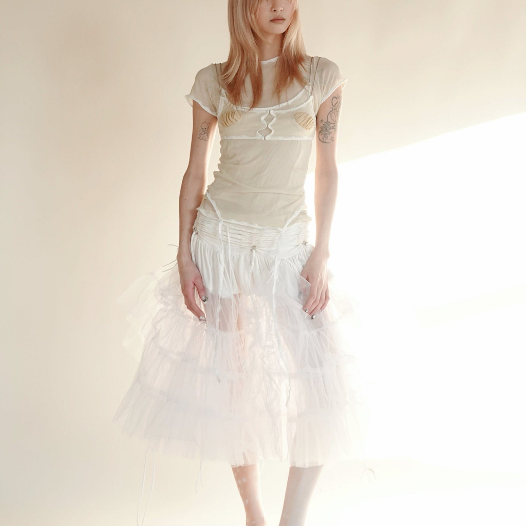 MEW FW25 SWAN gathered tule skirt // adjustable lace trim // 100% cotton upper tiers of the skirt // tule ruffles and with nylon/poly blend trim
