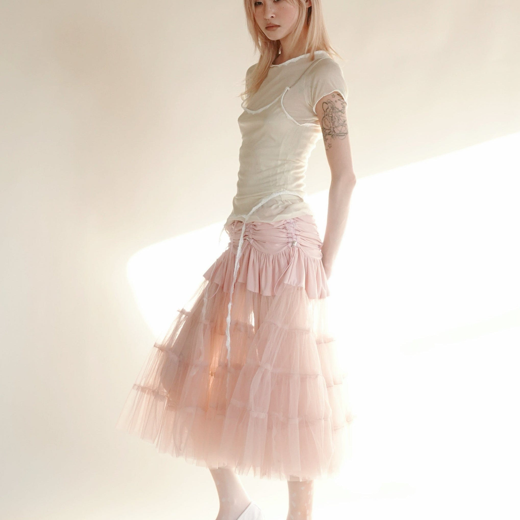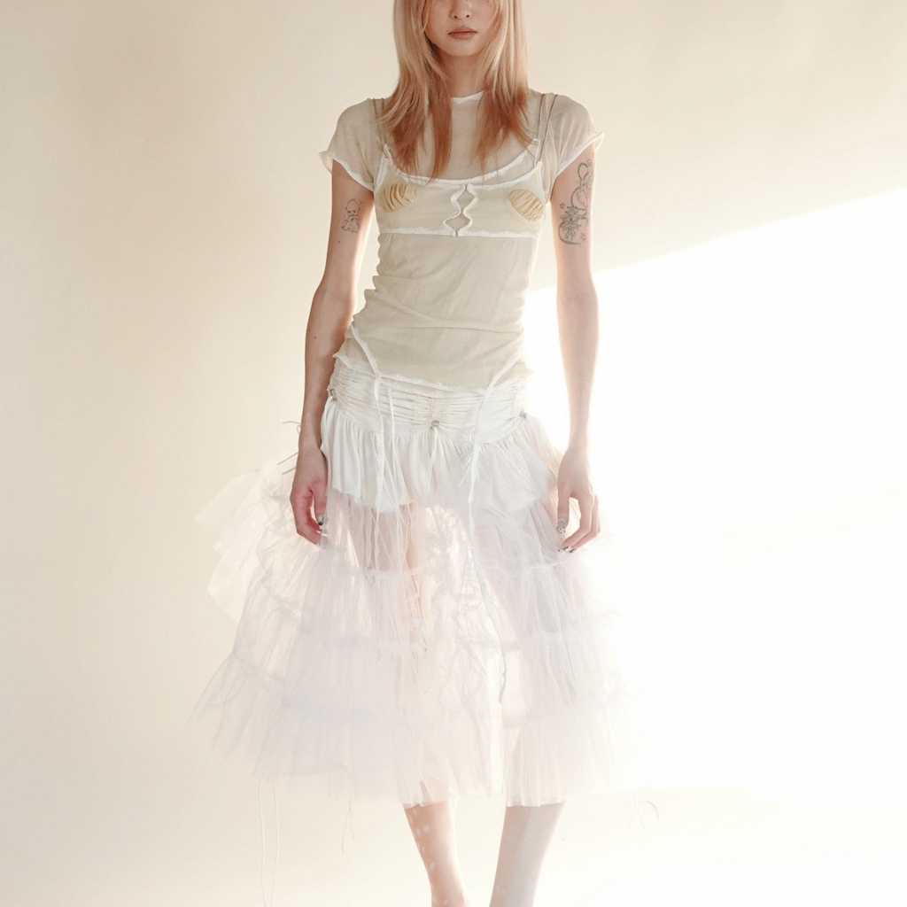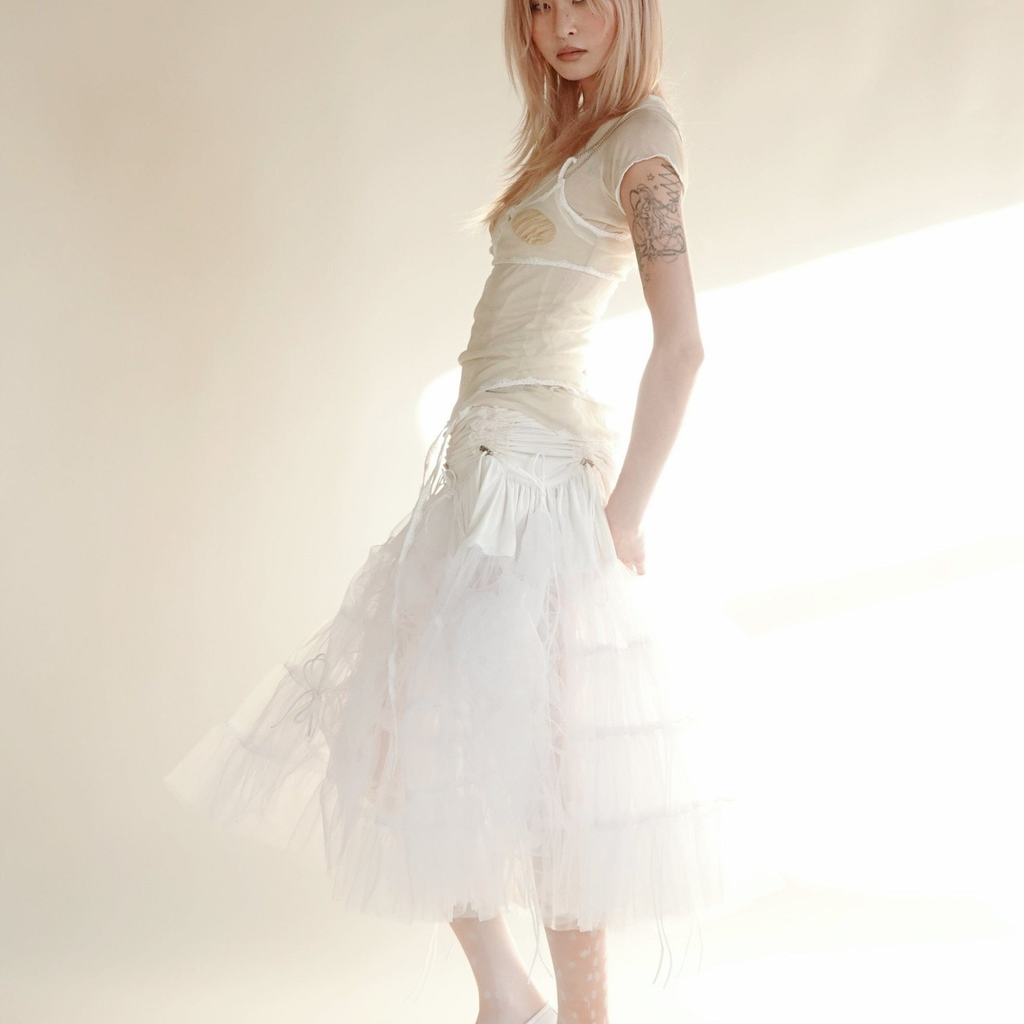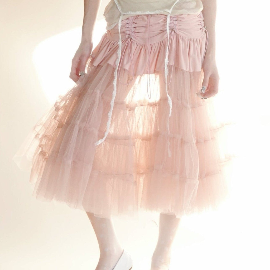 MEW FW25 SWAN gathered tule skirt // adjustable lace trim // 100% cotton upper tiers of the skirt // tule ruffles and with nylon/poly blend trim