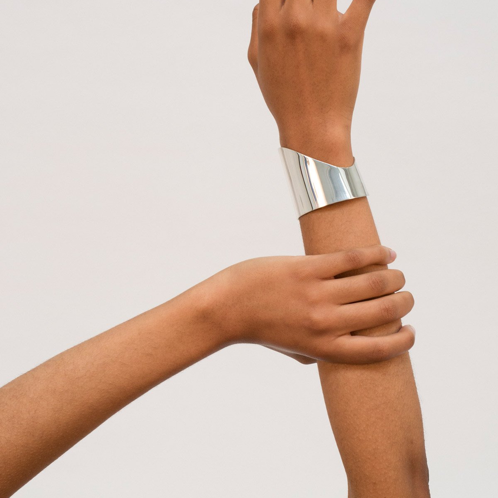 Wrist cuff which can be gently adjusted for best fit. Designed for the right wrist. No piercing needed.