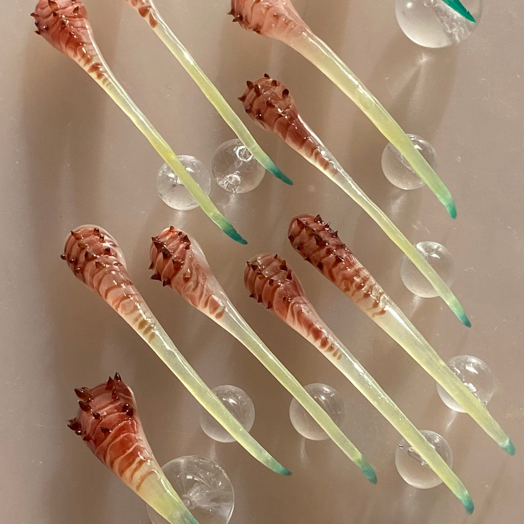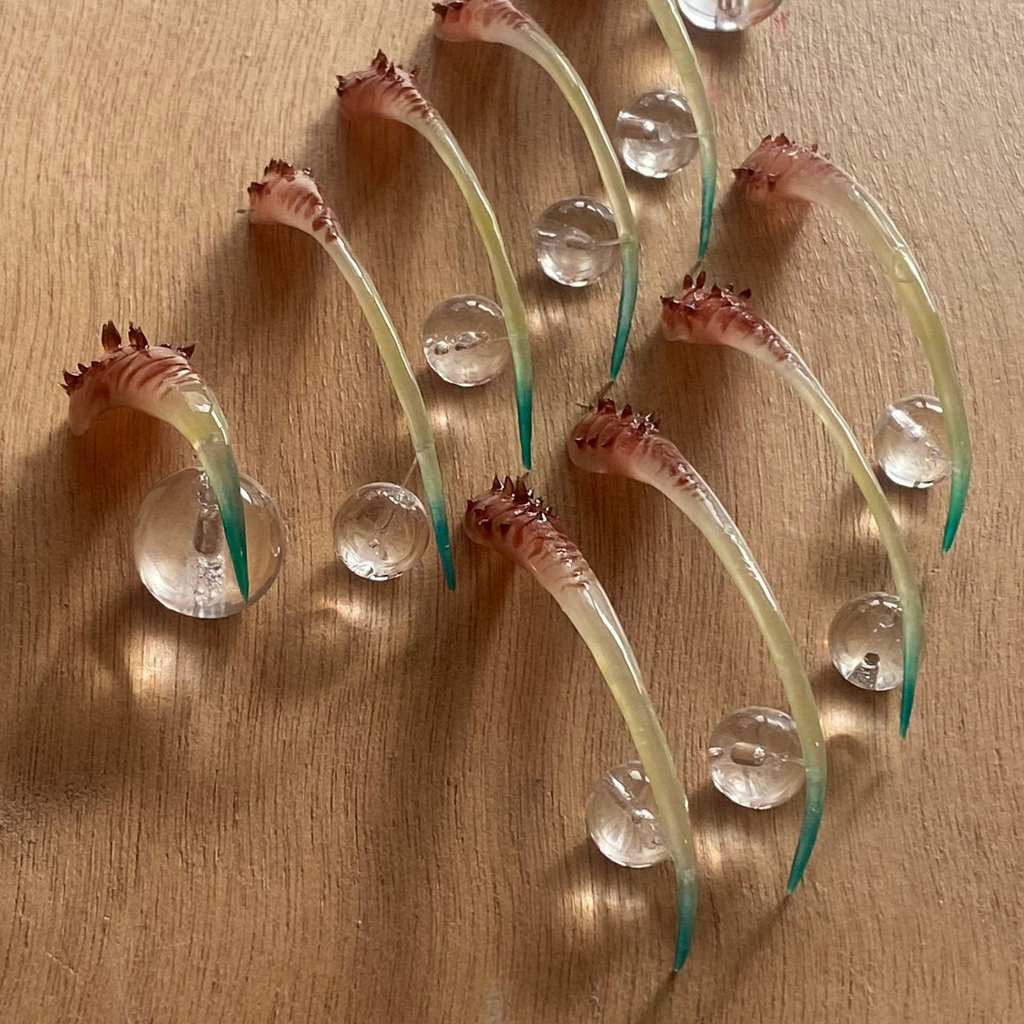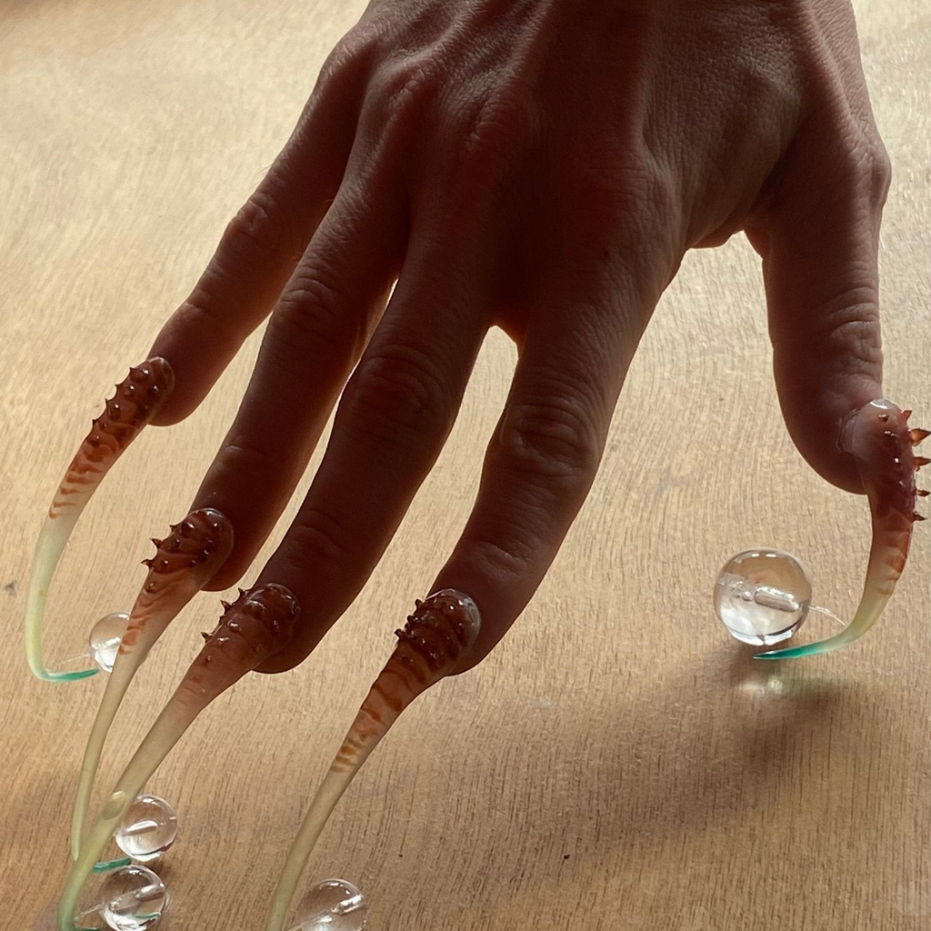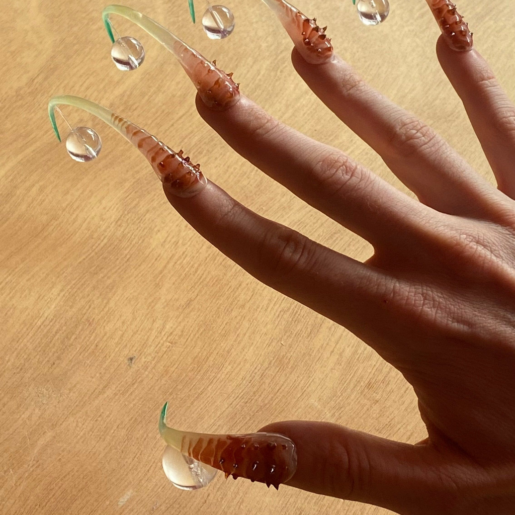 Handmade sculpted using acrygel, glass pearls and nylon wire.