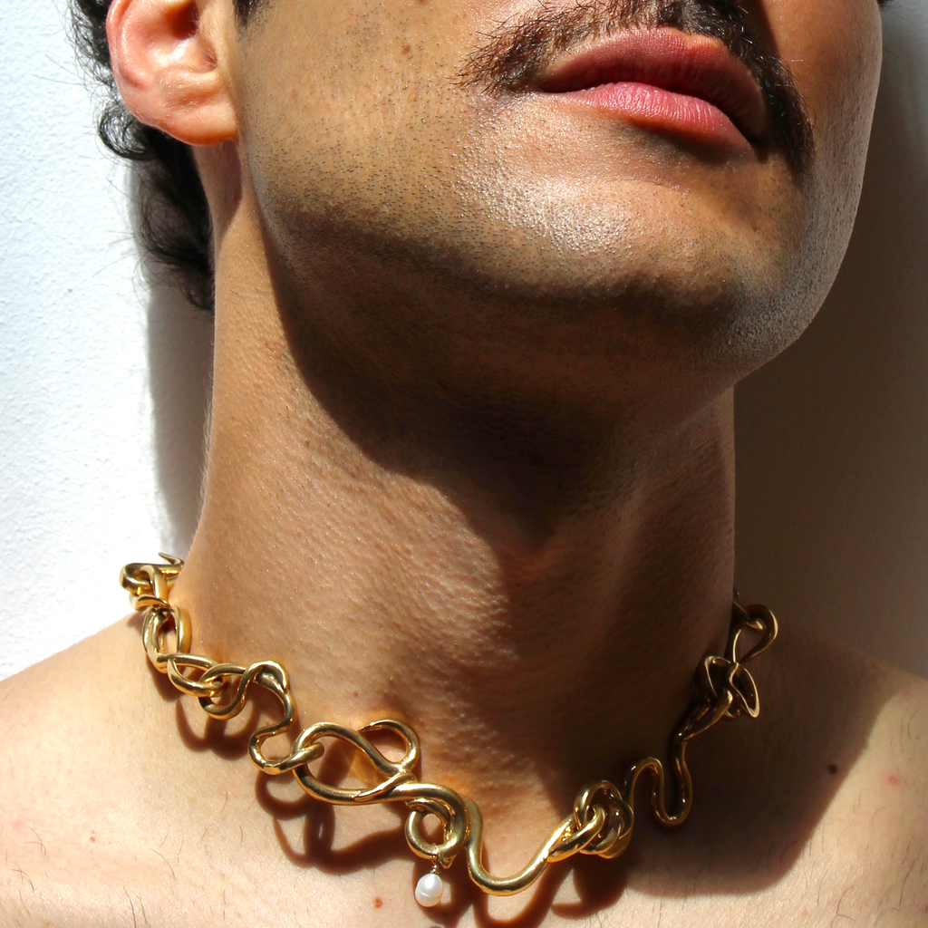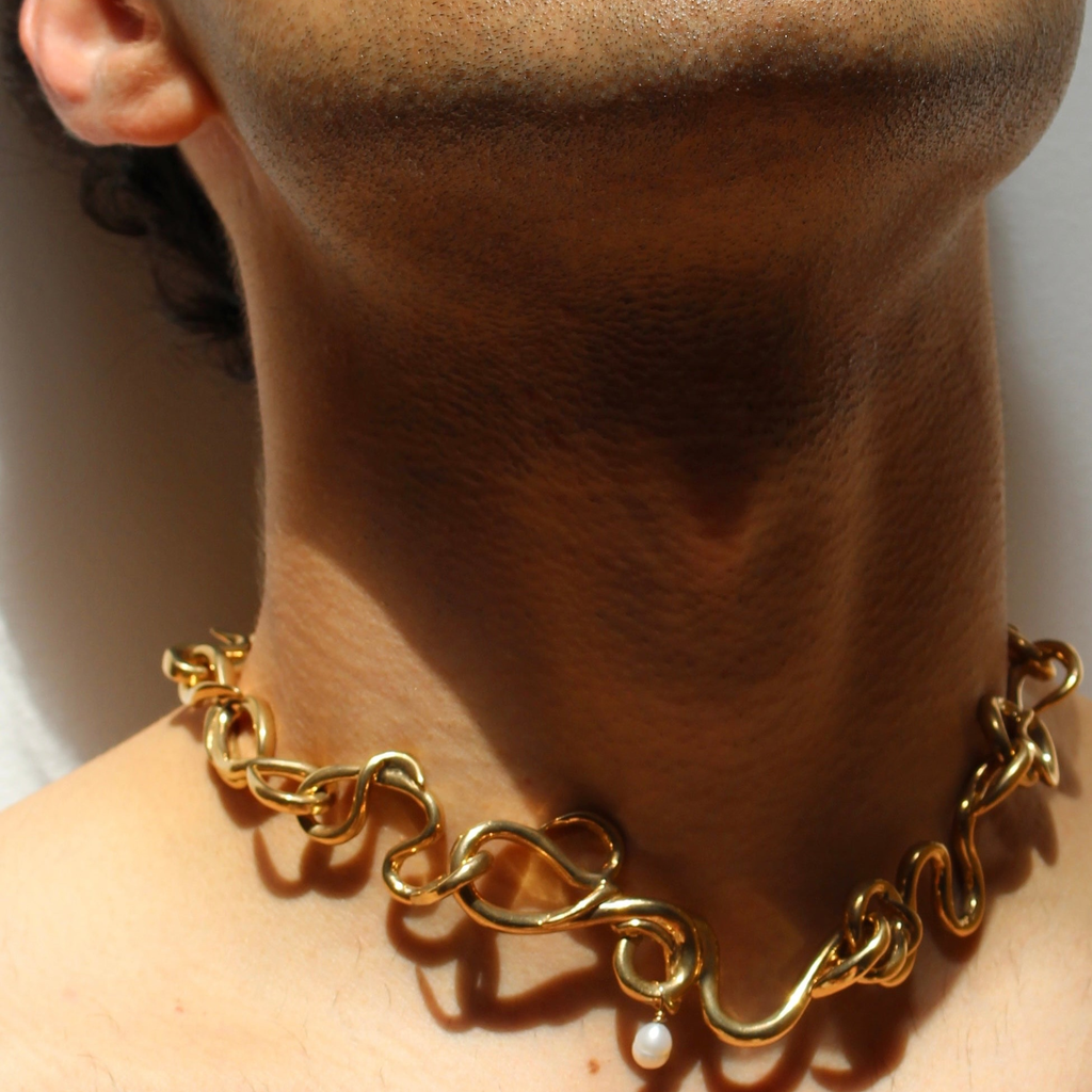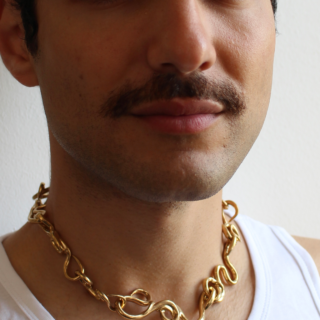 * This chain is hand crafted at every stage by the artist. Due to this, each piece will have different distinguishing marks. It has a hook and loop clasp. The hook goes over your left shoulder with the hook pointing down, and the loop goes over your right shoulder. It can take a bit of fiddling at first to get the links to sit comfortably.
