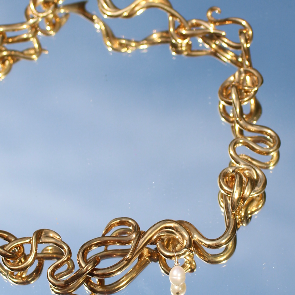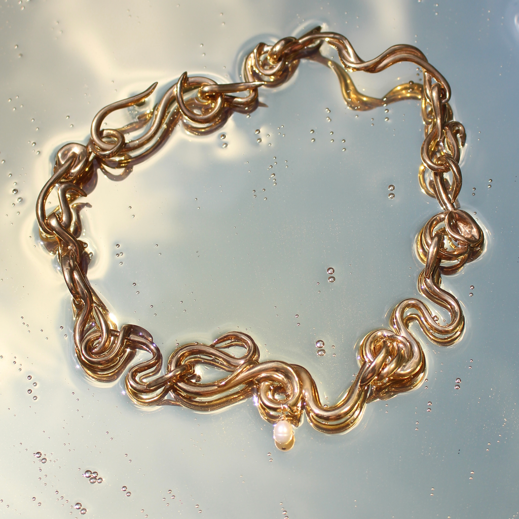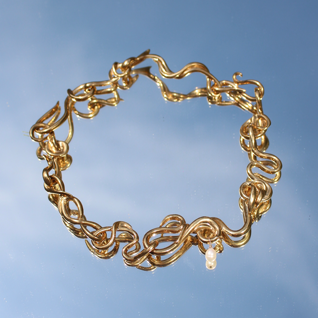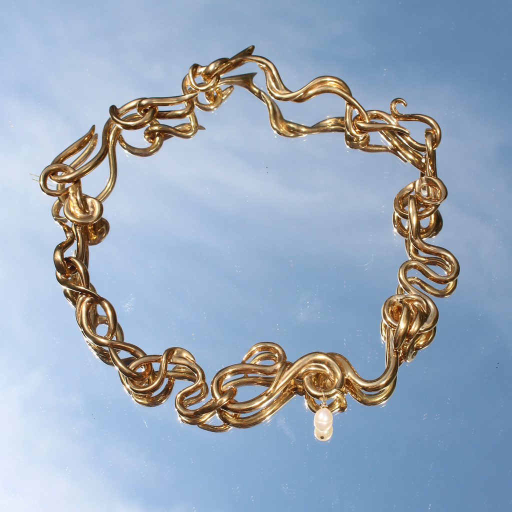 * This chain is hand crafted at every stage by the artist. Due to this, each piece will have different distinguishing marks. It has a hook and loop clasp. The hook goes over your left shoulder with the hook pointing down, and the loop goes over your right shoulder. It can take a bit of fiddling at first to get the links to sit comfortably.