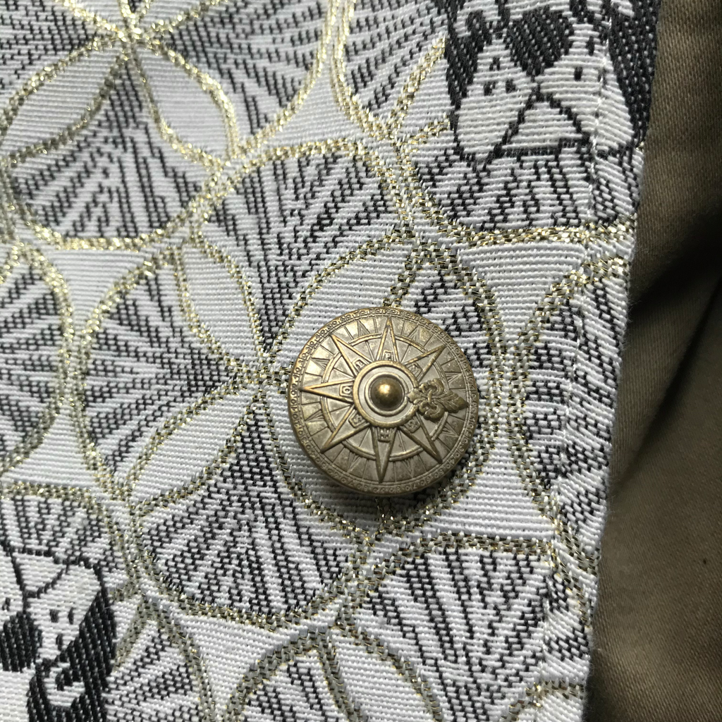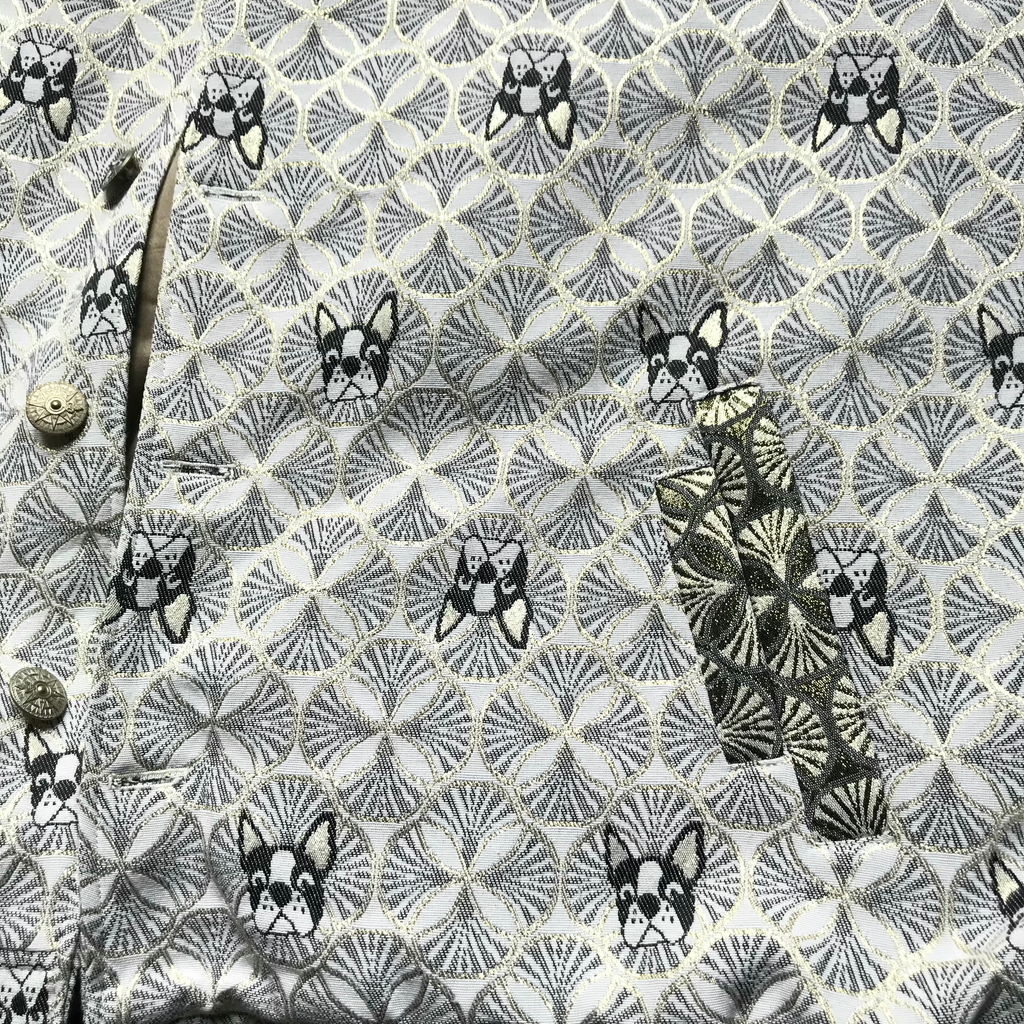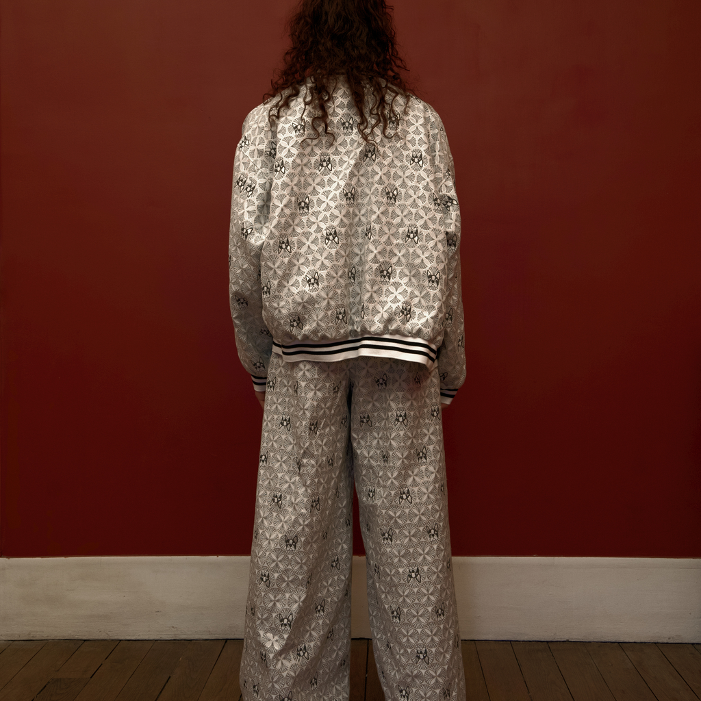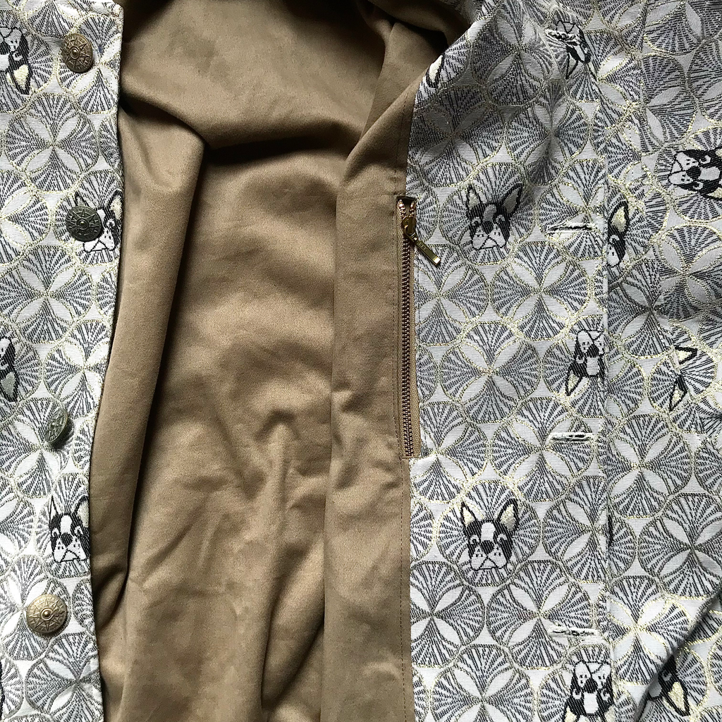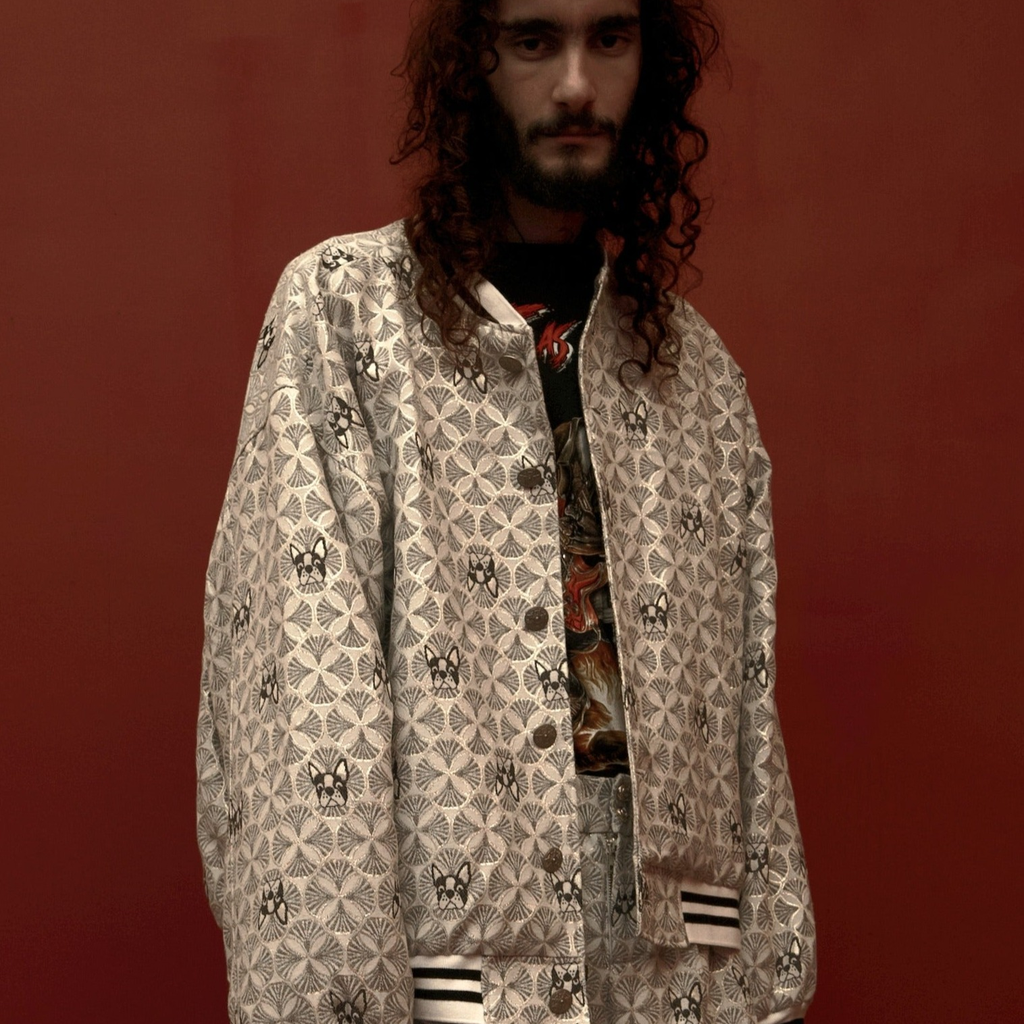 Oversized bomber jacket made of jacquard with a french bulldog pattern. Completed with three exterior pockets, one zippered inside pocket and antique metal buttons.