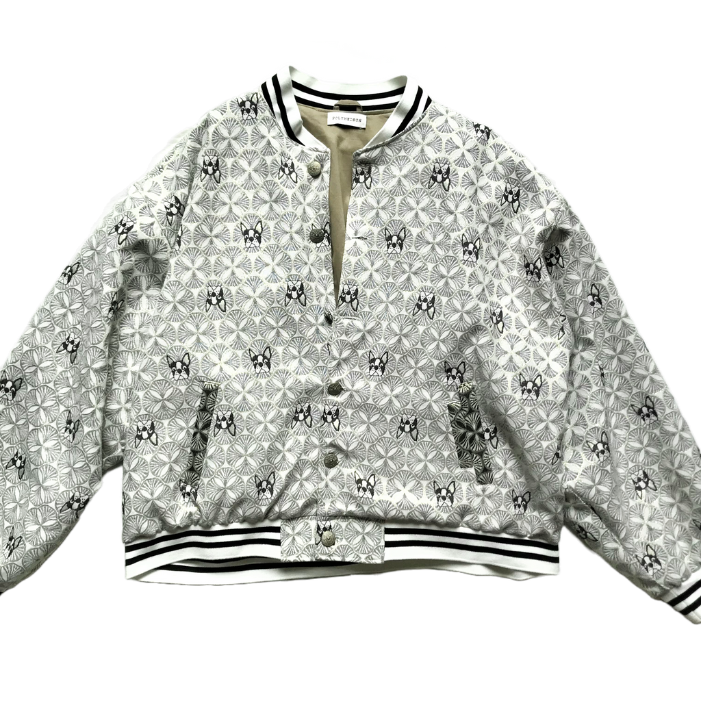 Oversized bomber jacket made of jacquard with a french bulldog pattern. Completed with three exterior pockets, one zippered inside pocket and antique metal buttons.