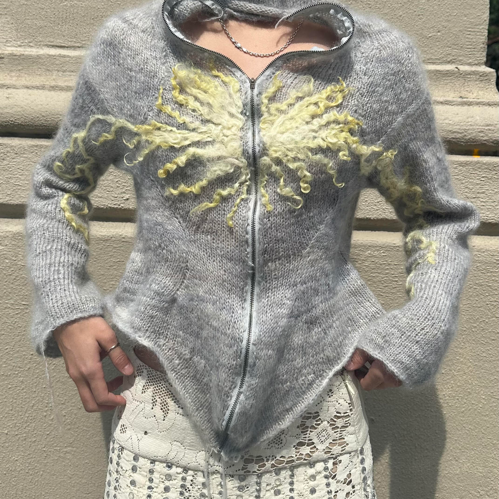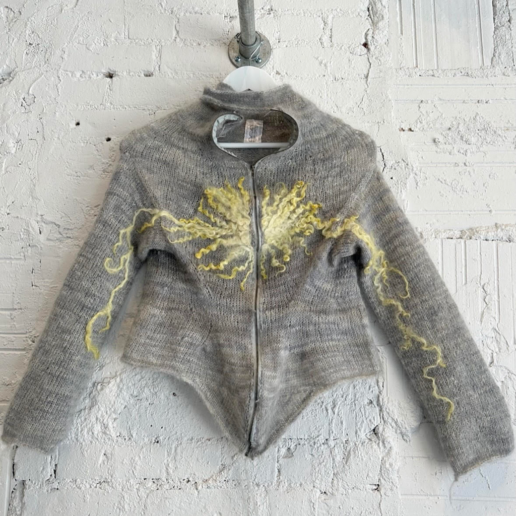 This Goldenrod Moto Zip Up is hand-knit with four skeins of artisanal mohair from a female farmer in Nova Scotia. Embroidered with hand-raised silk cocoons hatched from silkworm eggs and raised over the course of three months in Brooklyn NYC by GRACE GUI Studio.