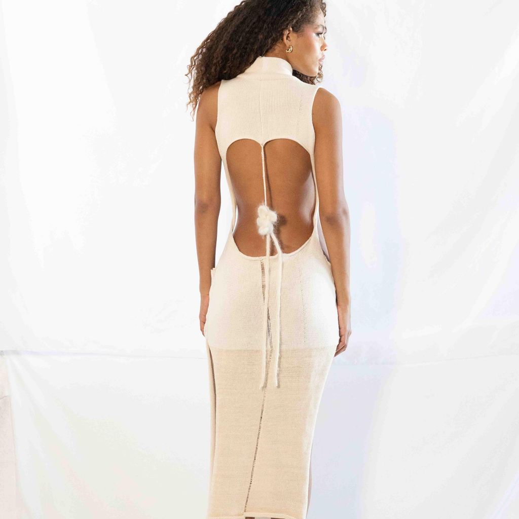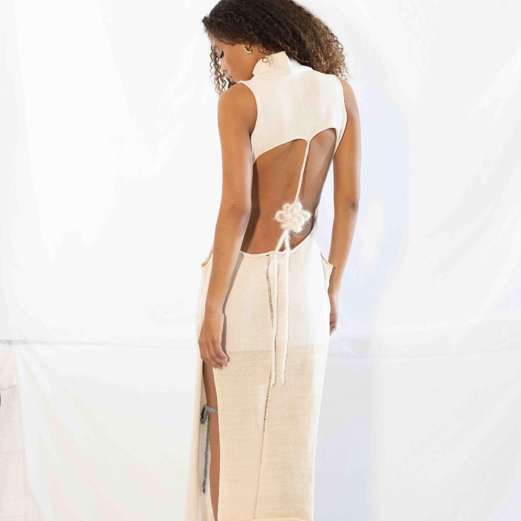 This Sunday Silk Cocoon Wedding Gown by GRACE GUI is knit with three cones of artisanal cotton yarn from Japan. Felted with artisanally dyed tussah silk from Japan and embroidered with foraged wild goldenrod silk cocoons sourced in NYC. Finished with vintage deadstock silk frog closures from Michigan and a deadstock mohair Chinese good luck knot.