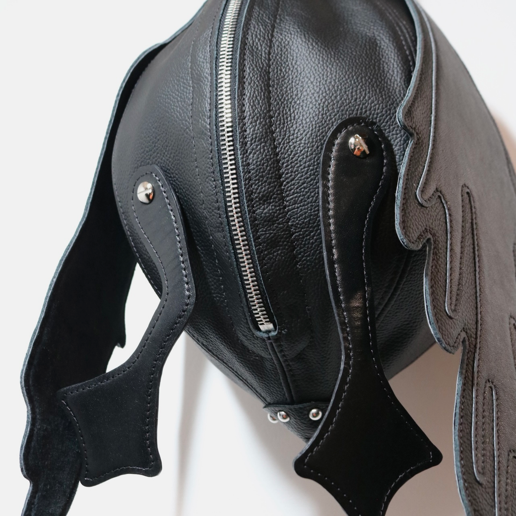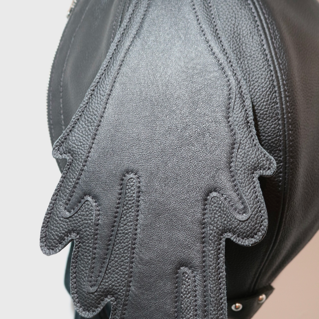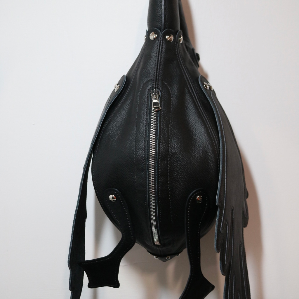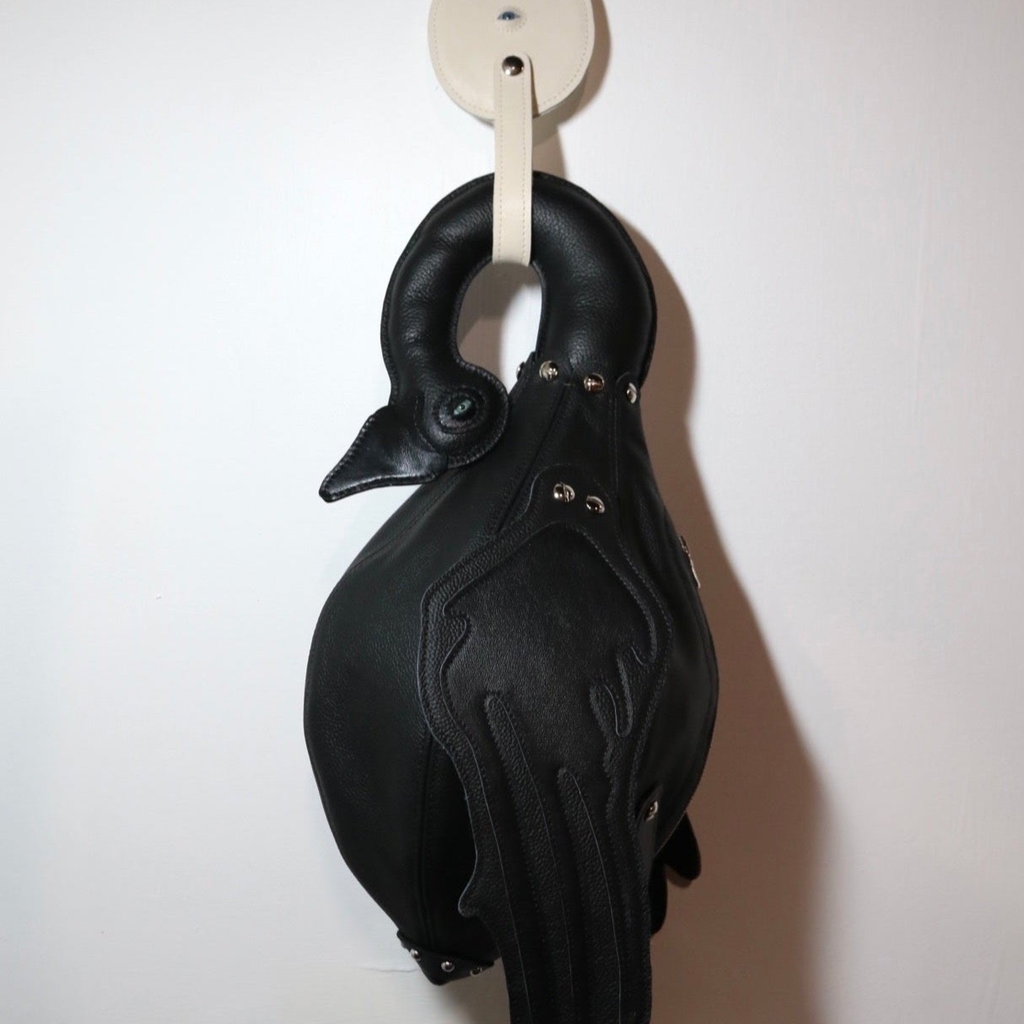 - Black and off-whiteThese bags are hand-sewn wearable sculptures by Av Grannan, Sublime Remains. Av creates these geese to live on the body as wearable functional art. Up-cycled and deadstock materials are the base of the geese. The meticulously sewn layers of leather create a new story for the owner. The bag has a 9-inch zipper opening into the stomach of the goose. Inside the goose, you will find its egg. The bag is a piece of art – wear it with care.
