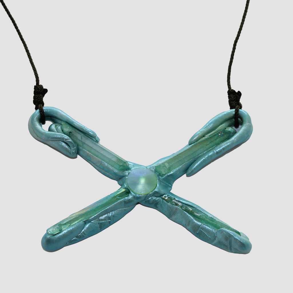 Emma Pryde is an artist and jewelry designer based in Los Angeles. Her work combines visual motifs from various time periods to produce hybrid, shimmering objects that embody the idea that the digital world collapses history. Inspired by childhood toys, mythical creatures, video game characters, and ancient artworks, she synthesizes her references to create new artifacts from alternate worlds. Her work is composed out of a variety of materials including ceramic, cast porcelain, epoxy, laser-cut acrylic, and other mixed media.