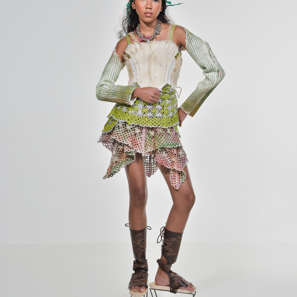 Handmade crochet top in recycled cotton and organic latex coating, painted by craftsmen in the Amazon rainforest.