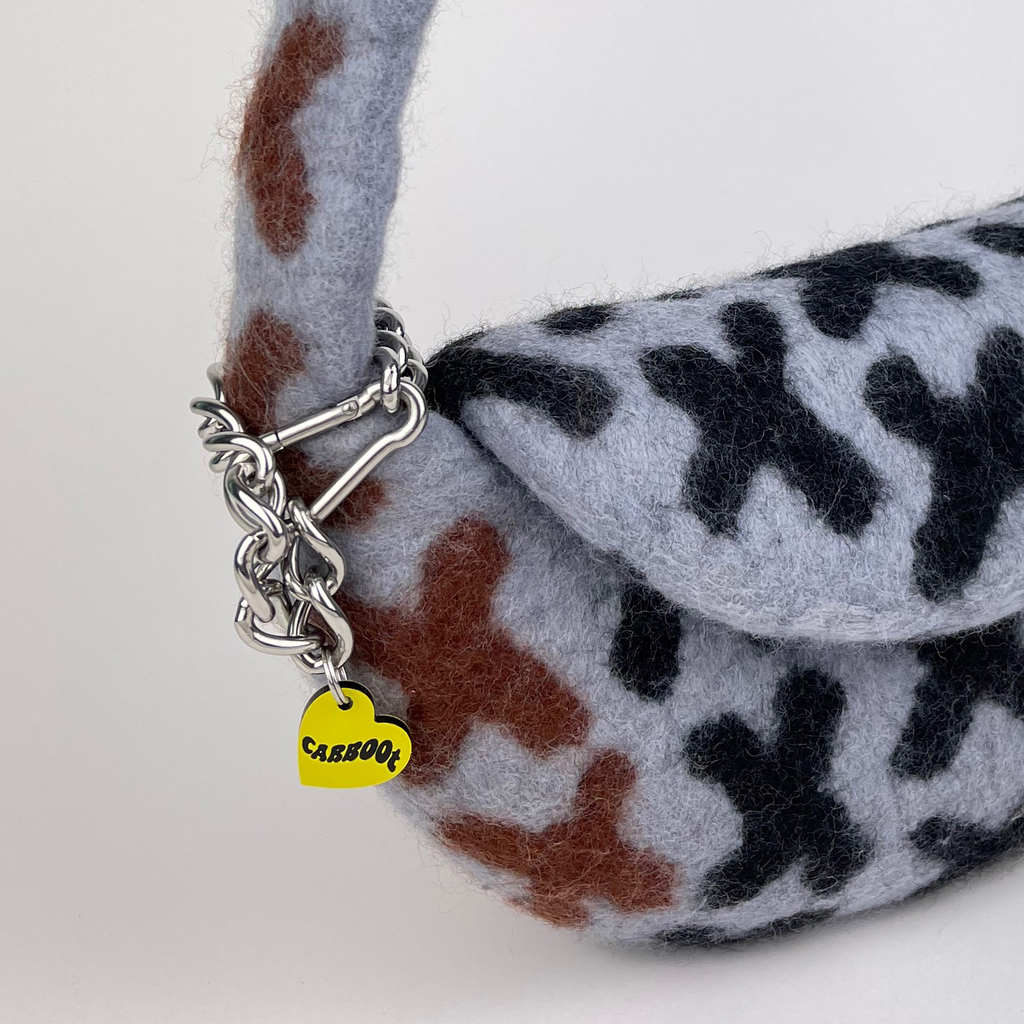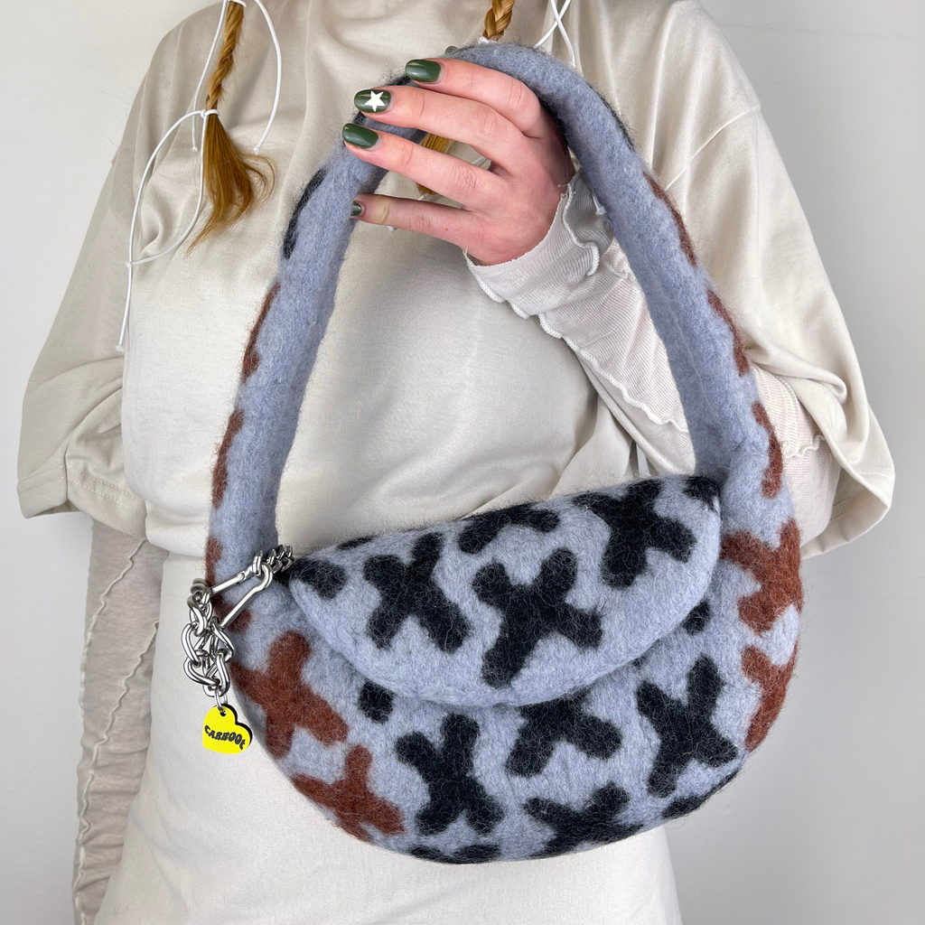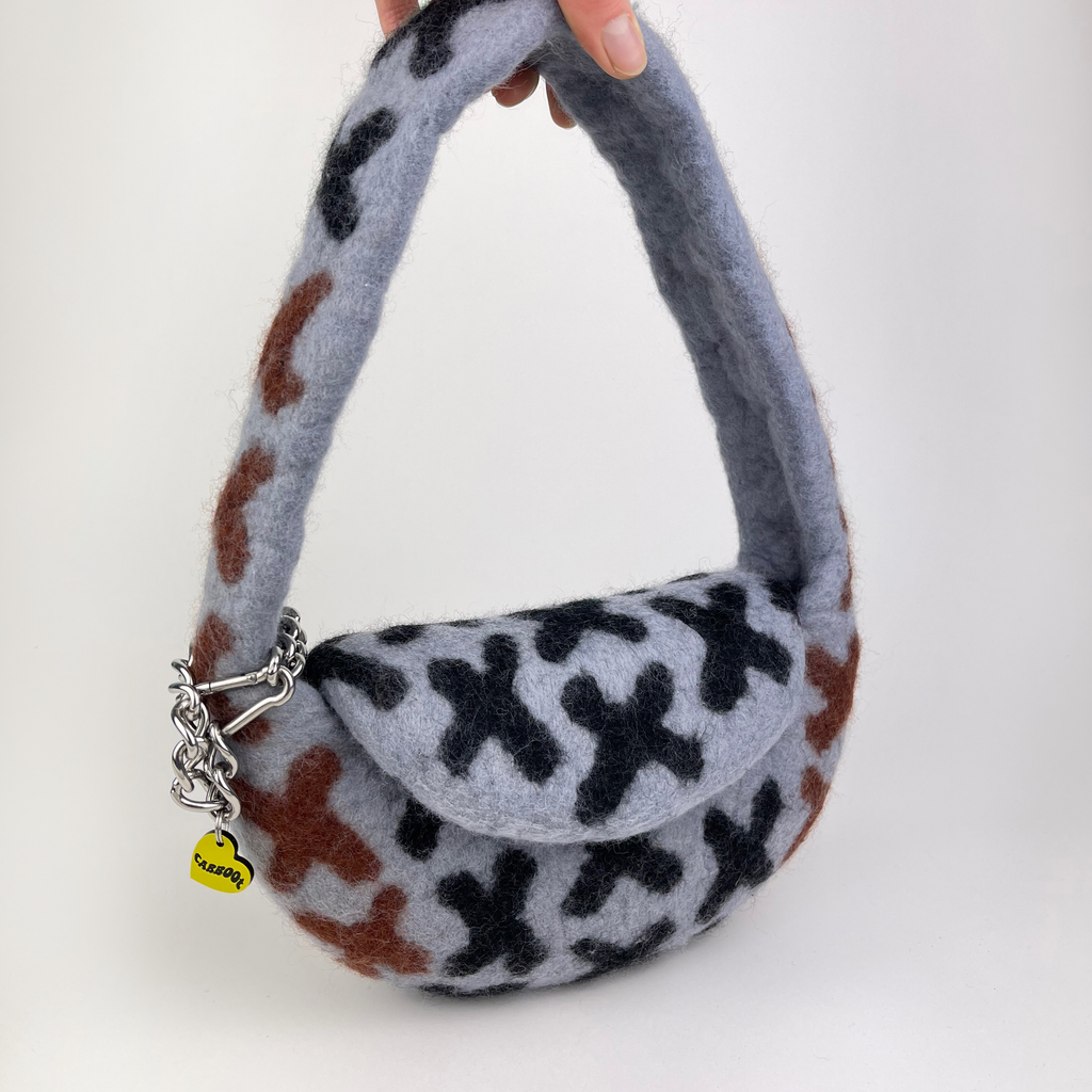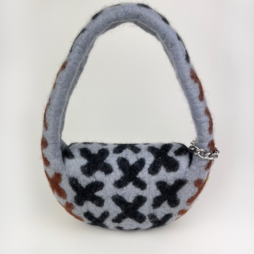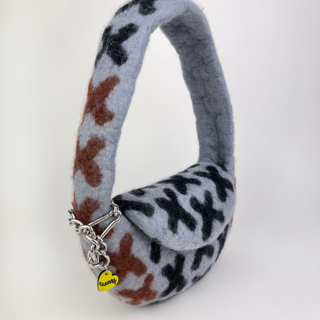 A solid, hand-felted, rounded handbag with an integrated marble effect. Fastened with a magnetic snap closure and finished with a stainless steel chain and heart shaped Carboot tag. Fits an iphone maxi, slim wallet, keys, lipgloss.