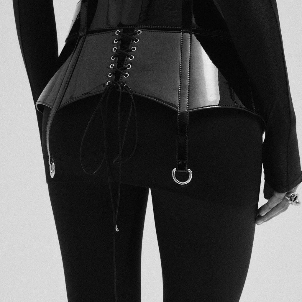 Vinyl and calfskin leather Guepiere with removable belt, decorative metal loops, front fastening and back adjustable lacing. Featuring an oversized brushed silver metal buckle and signature logo jewel detail.