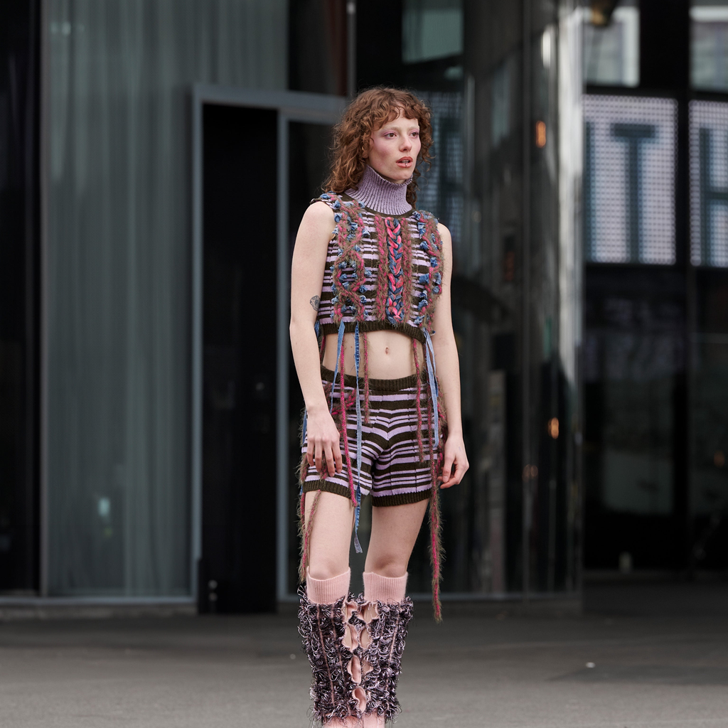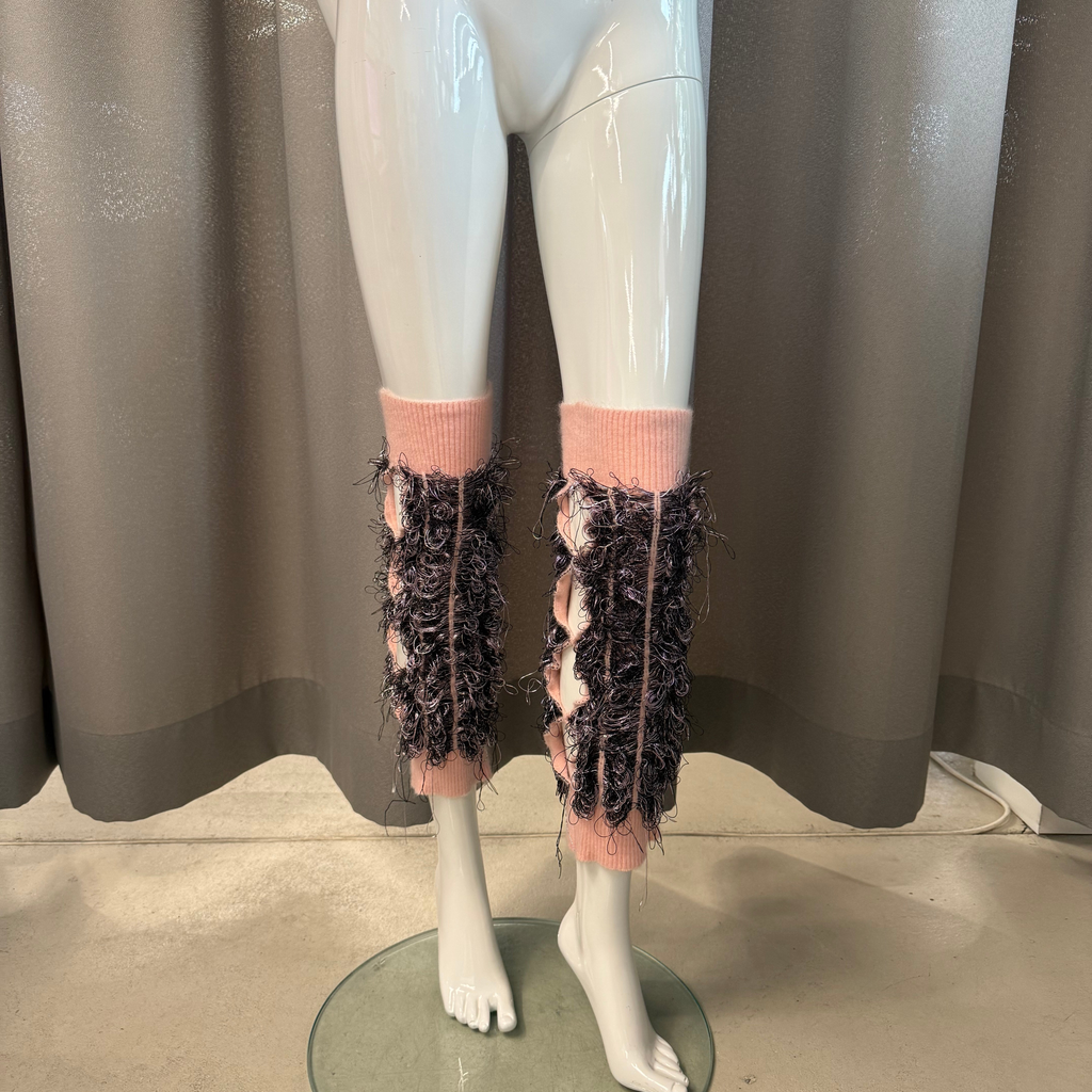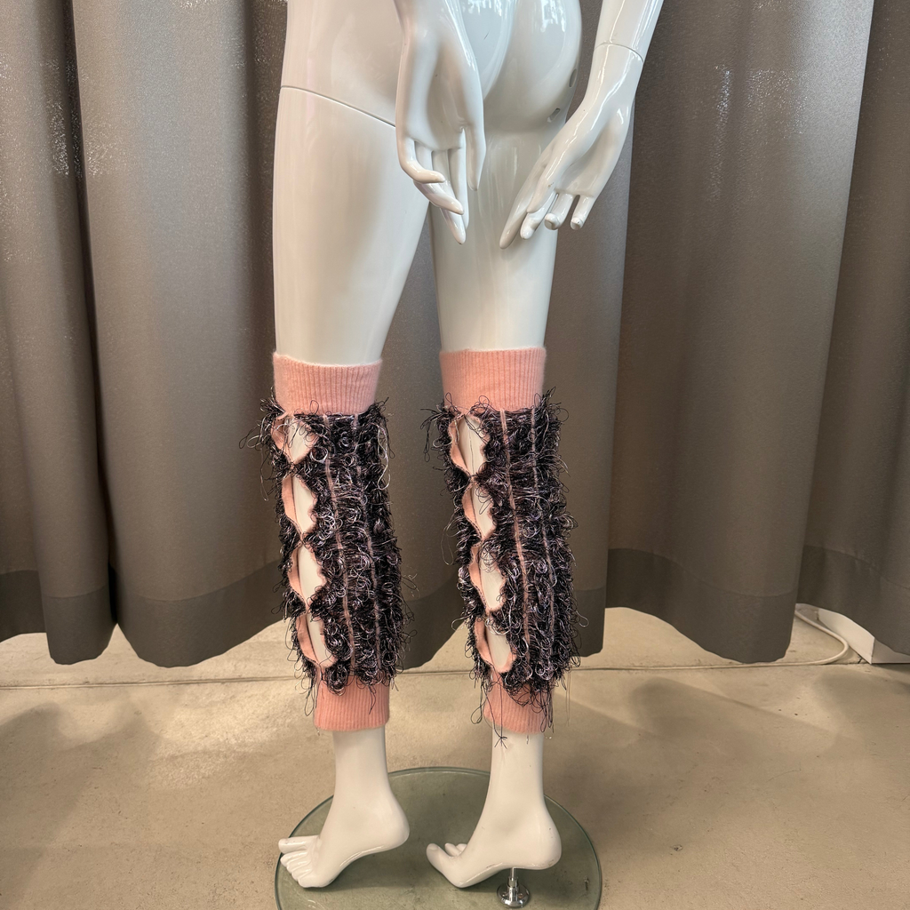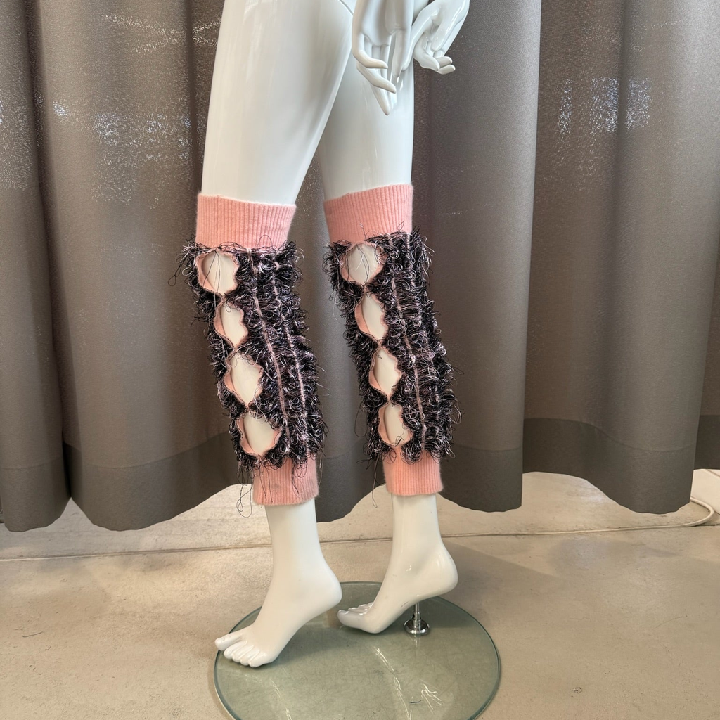 Long leg warmers in hairy structure with hole details on both sides and fine rib on ends