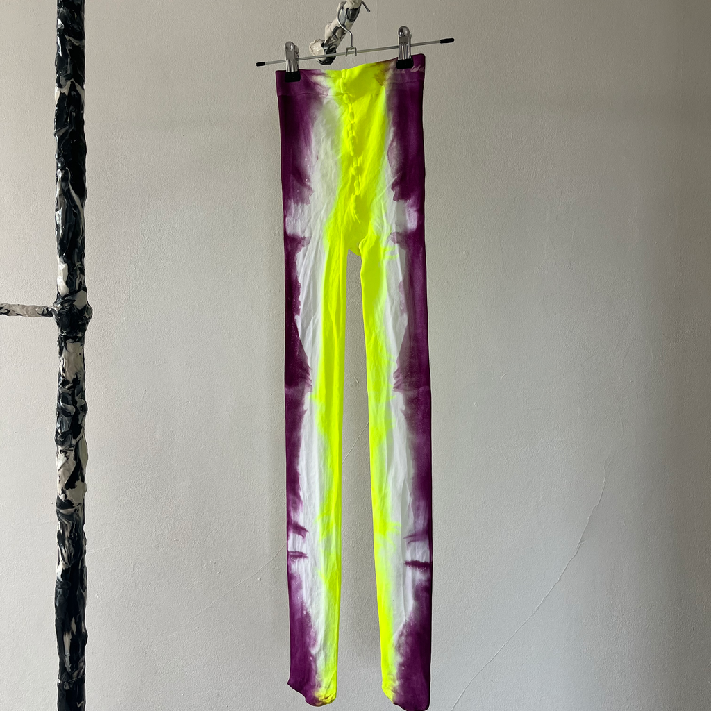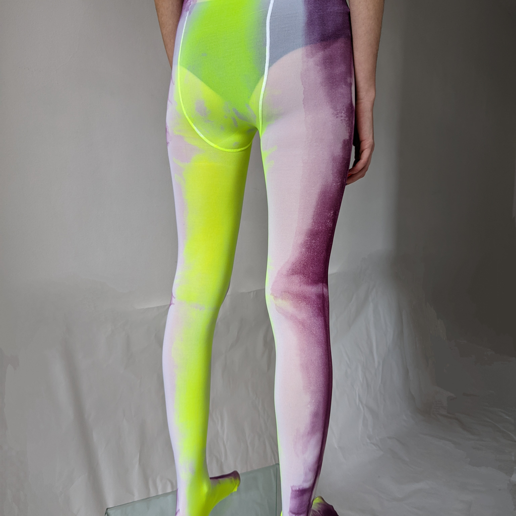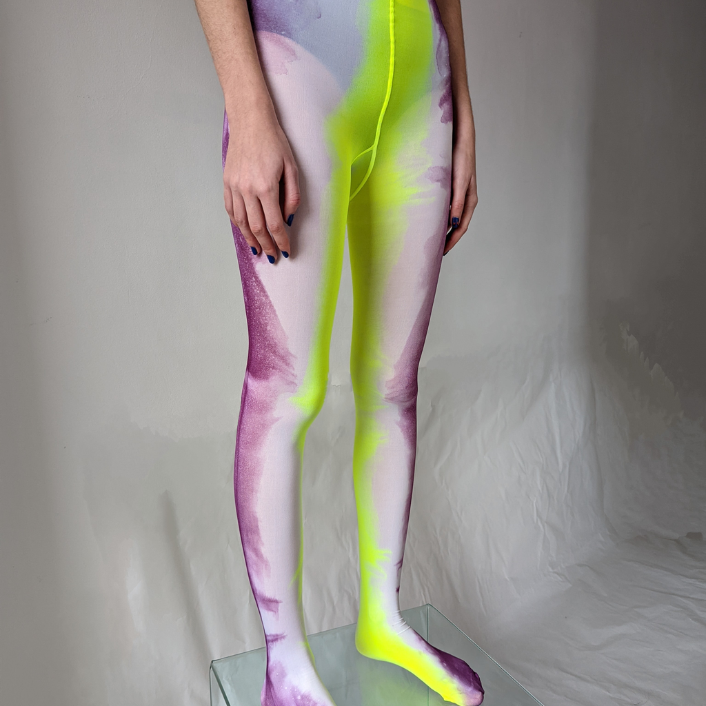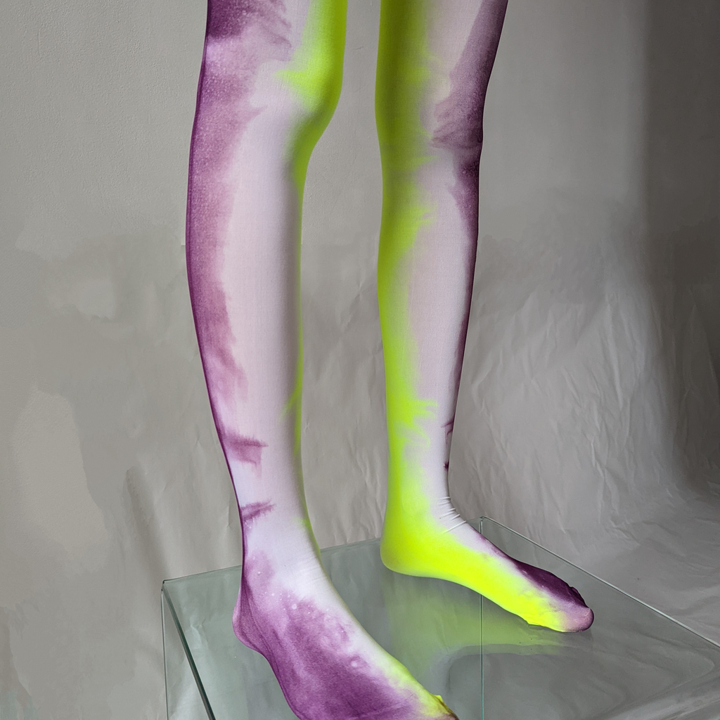Two-tone hand-dyed tights made in London. Each pair is unique and varies in shape and tie pattern.