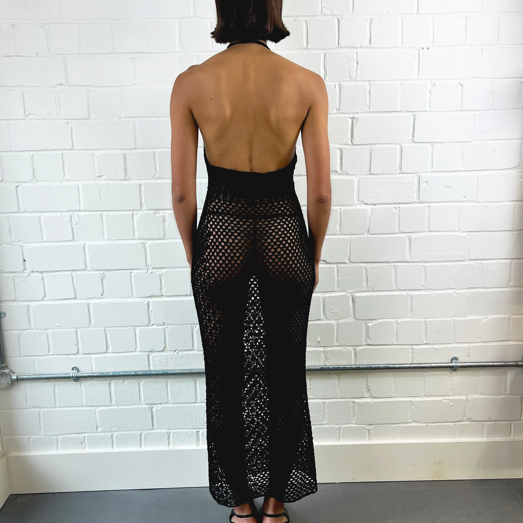 Open hand-crocheted organic cotton dress.