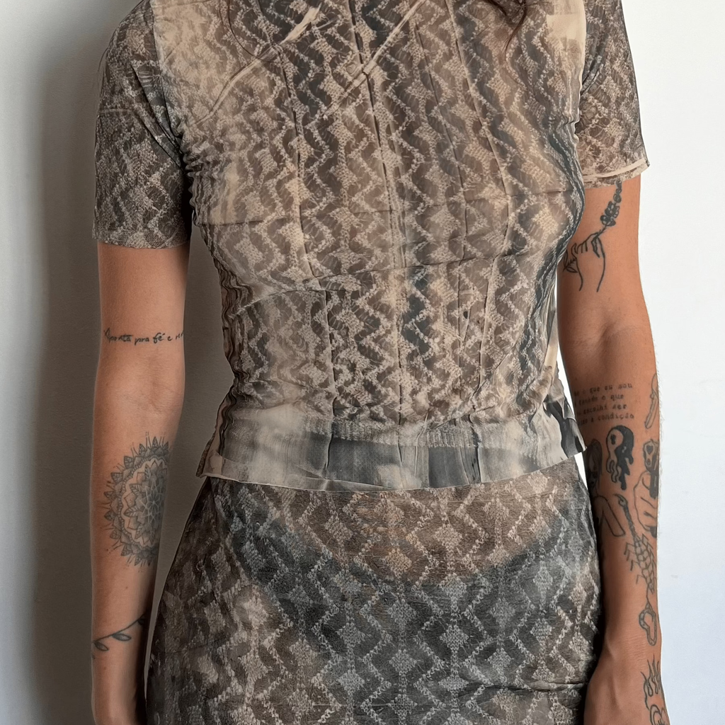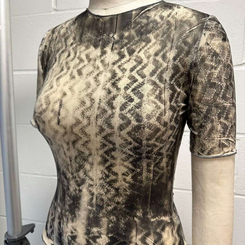 Slim fit, one piece high collar, short sleeves, abstract pattern, semi-sheer. Made in London. Due to the artisanal nature of the print technique, every piece is one-of-a-kind, and each product features subtle variations in texture and finish, making it truly unique.