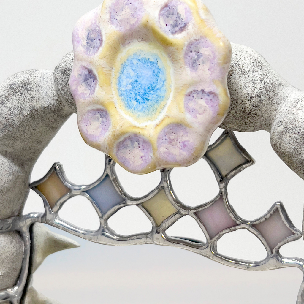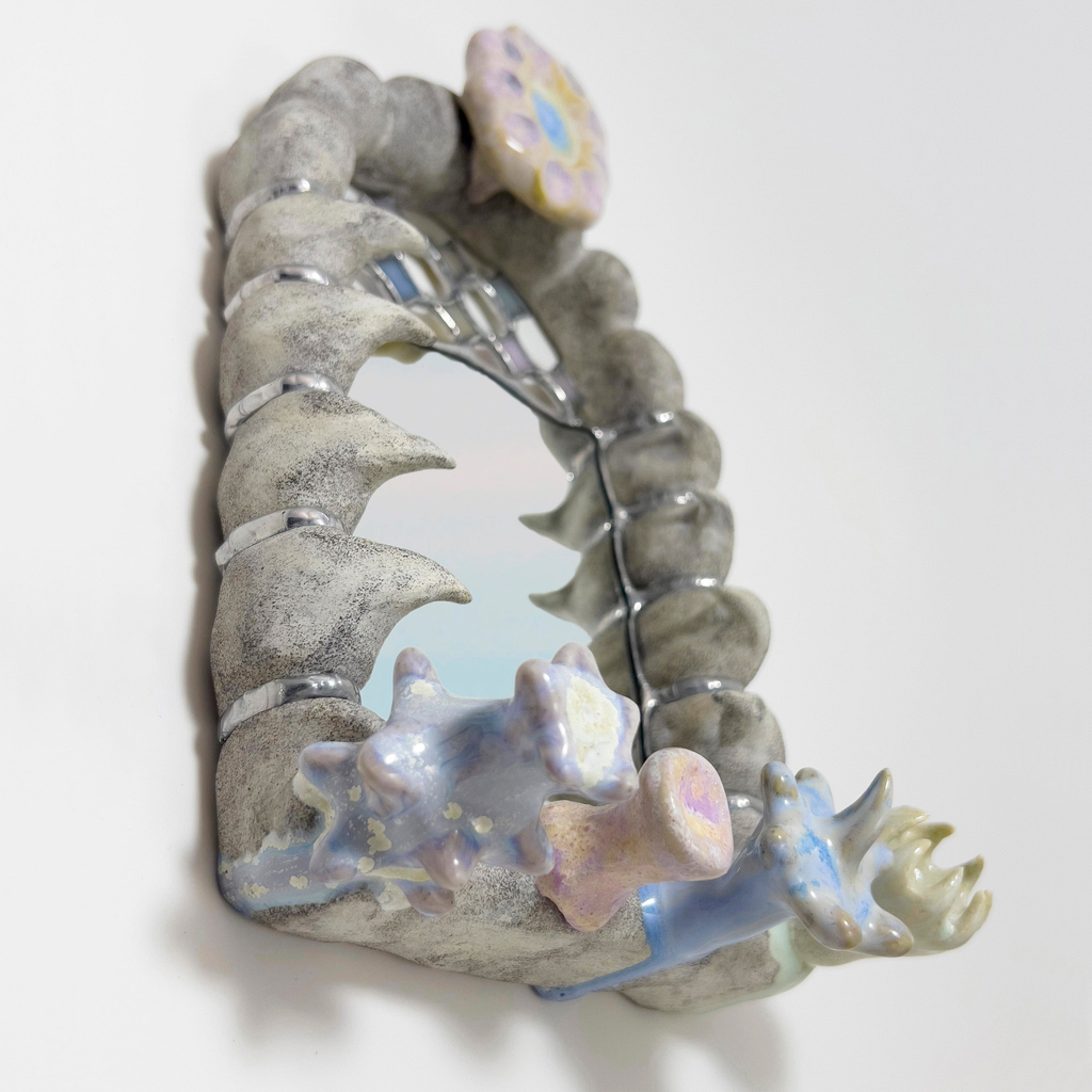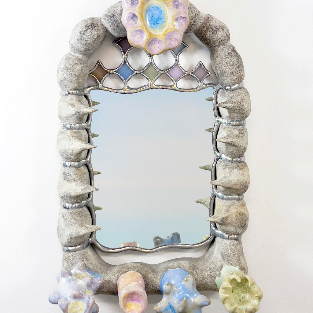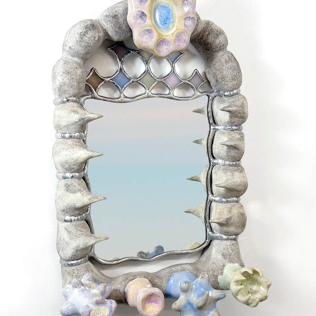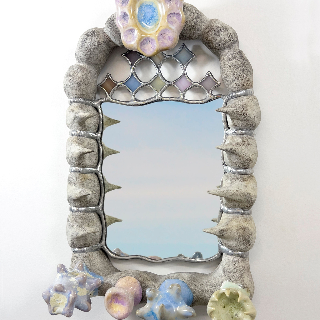 Hand-sculpted ceramic wall mirror designed to hang jewelry or other small items. Created using reclaimed mirror with iridescent glass details. Each piece is made-to-order, ensuring no two are exactly alike - subtle variations in form, finish and glass textures may occur.