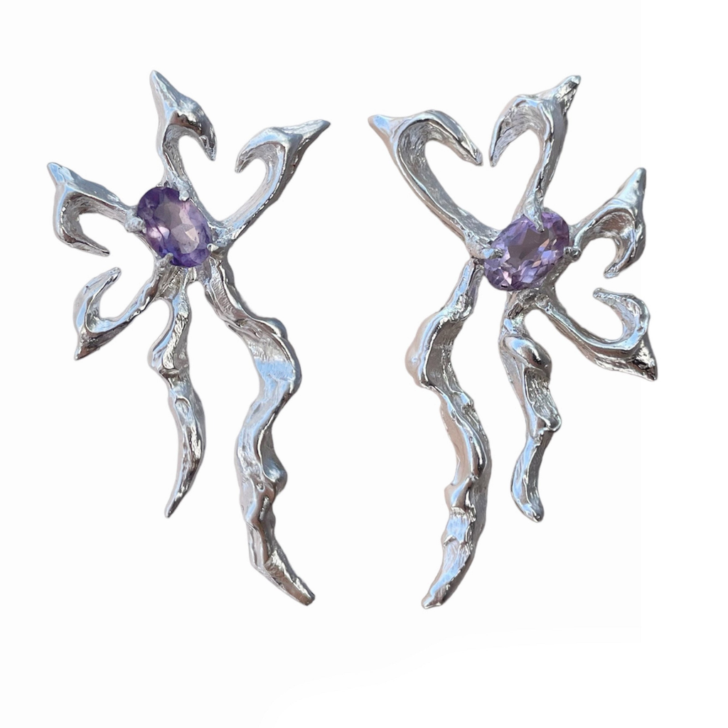 Solid sterling silver spikey heart with bow earrings with preferred precious gemstone. It comes with sterling silver push back.