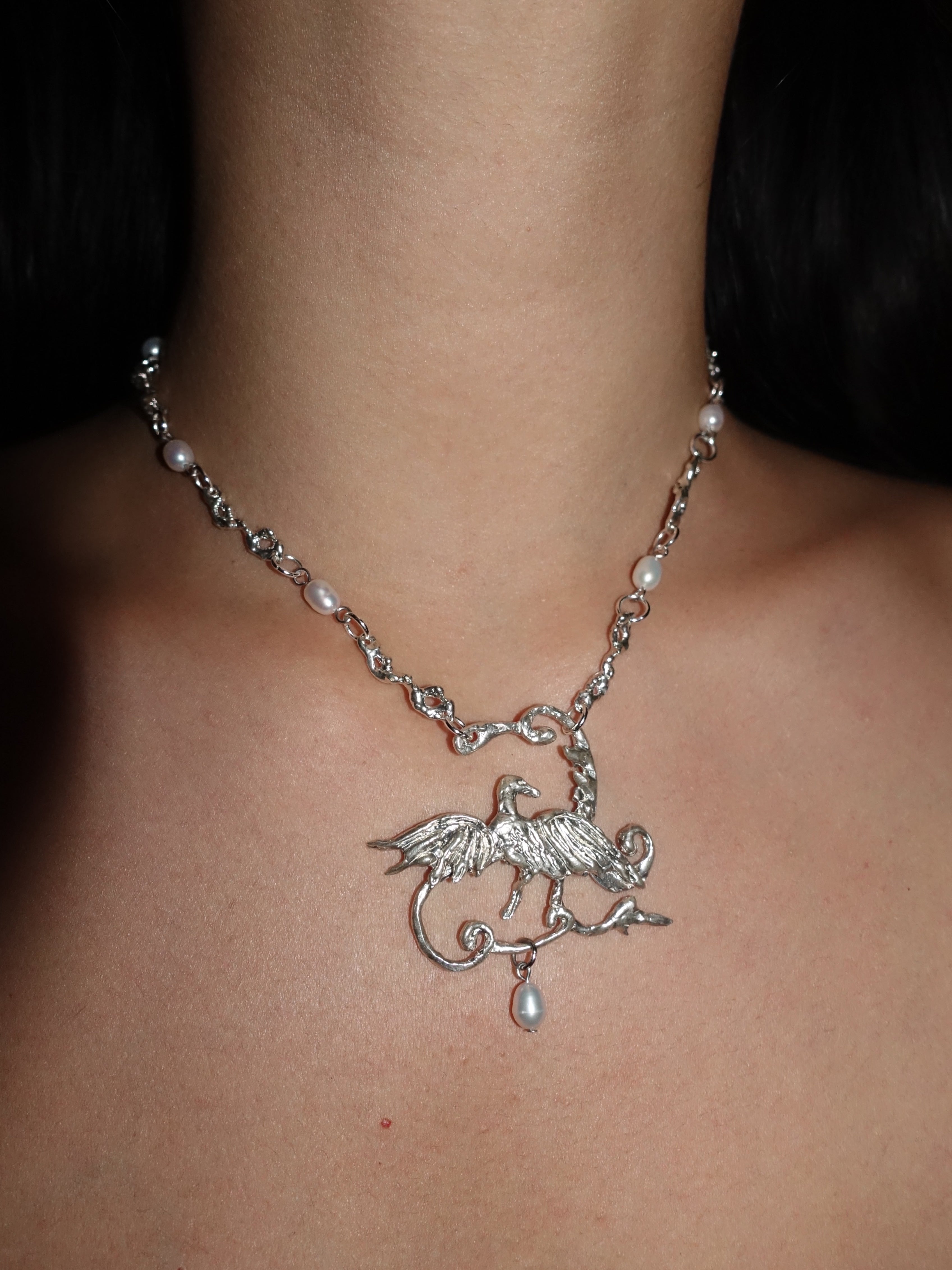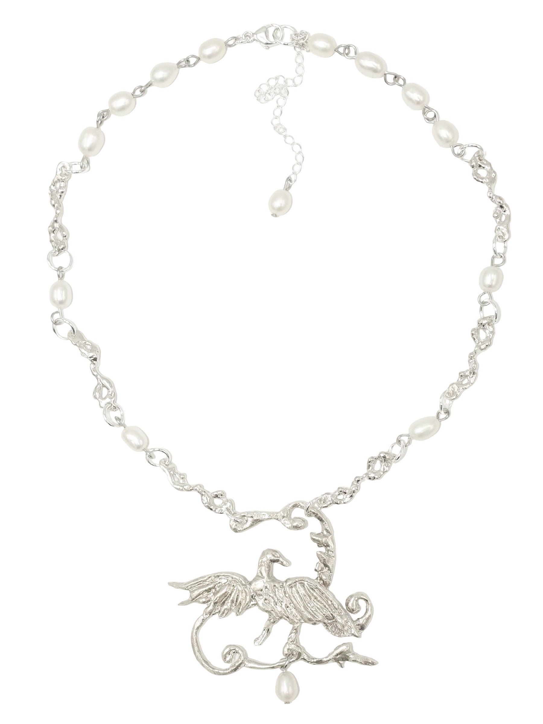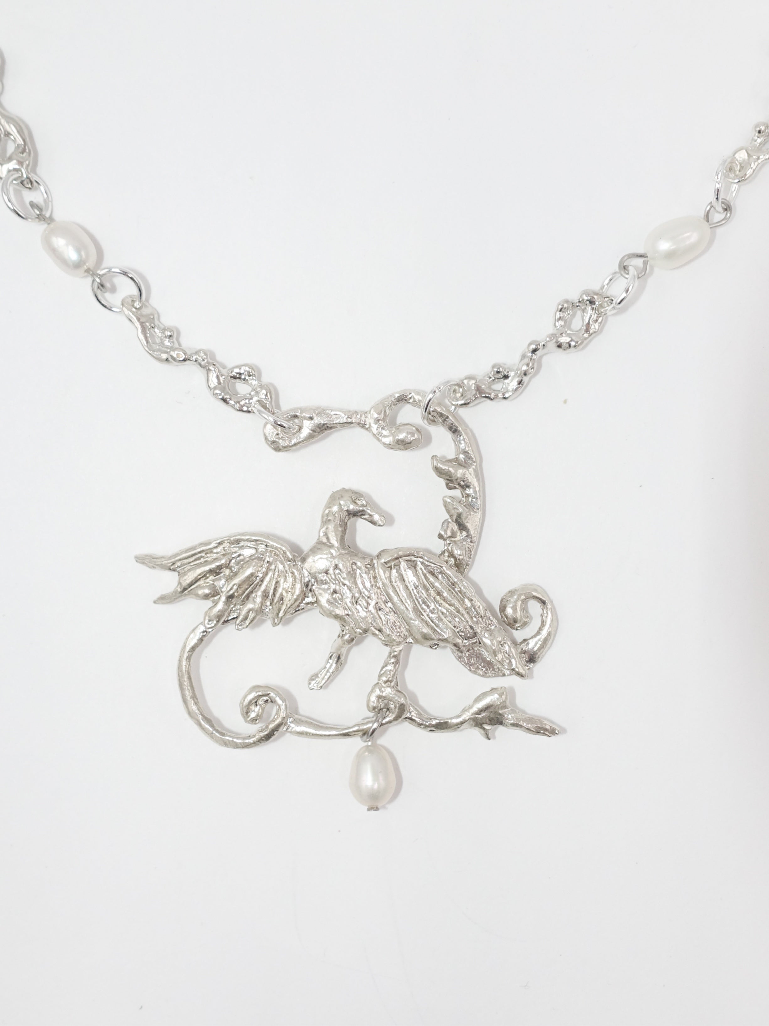 Handmade sterling silver necklace with hand carved swirl framed bird motif, textured chain link side pieces, and a dangling freshwater peal.