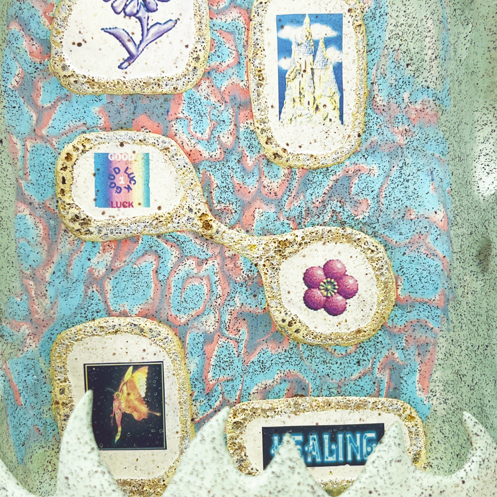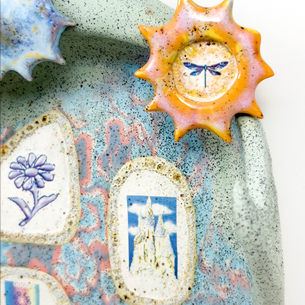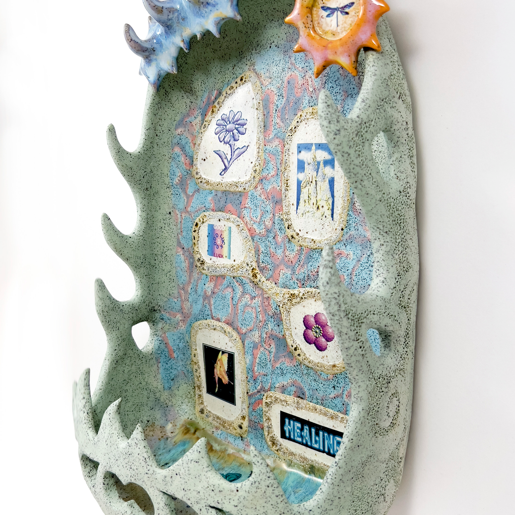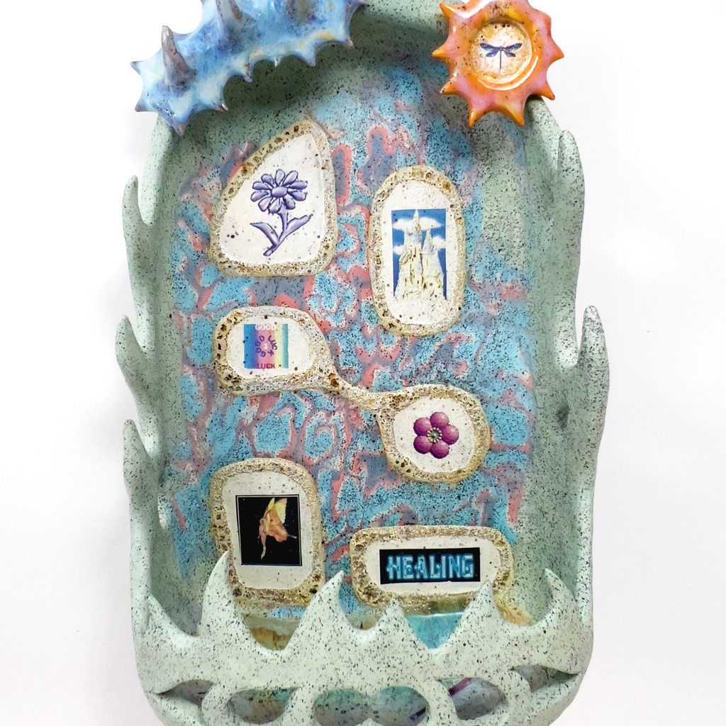Hand sculpted, wall-mounted ceramic shelf to hold jewelry, keepsakes, or other small accessories. Made from stained porcelain with nerikomi patterning and ceramic decals of found early-2000s Internet gifs. Hanging hardware included.