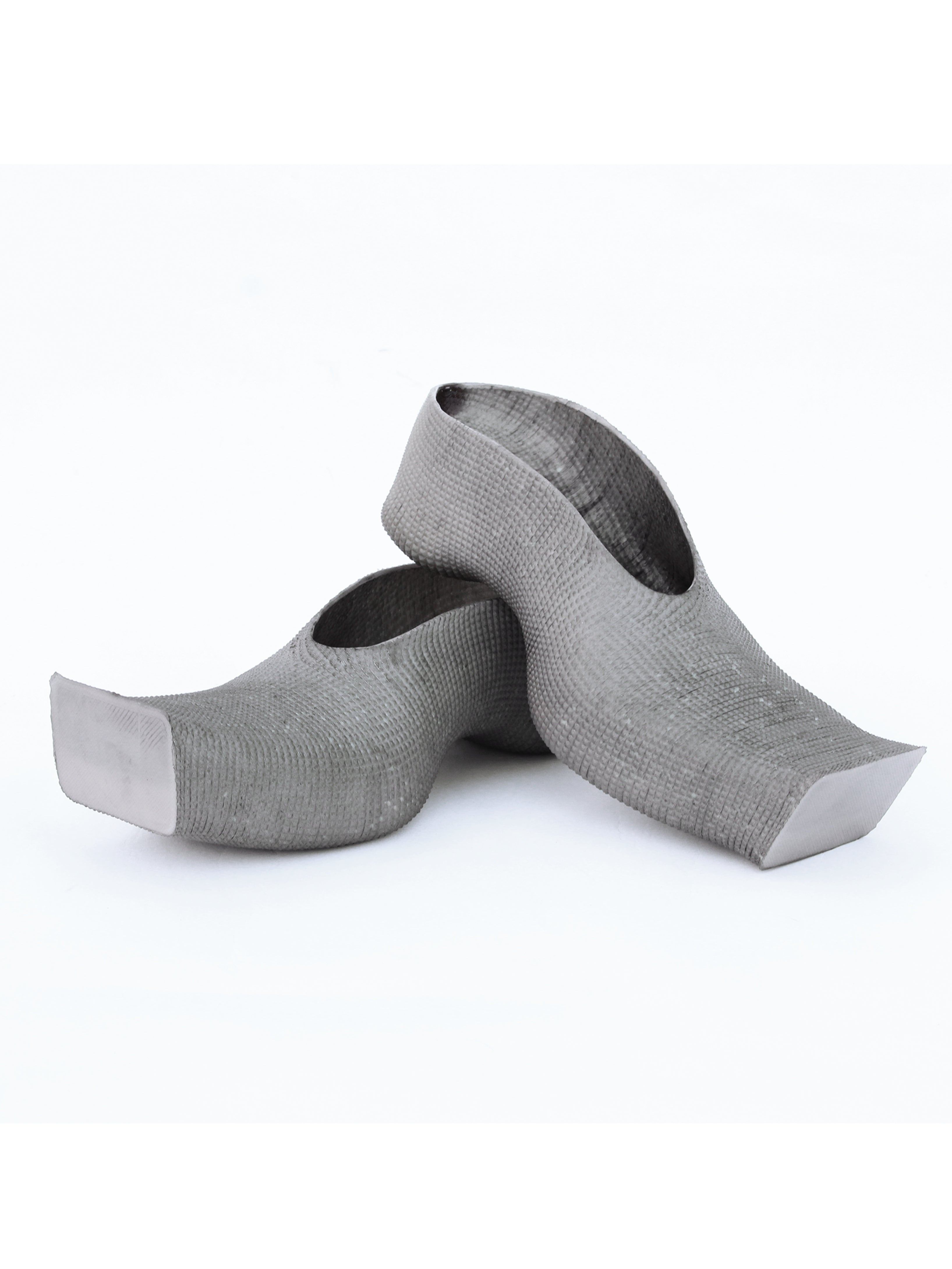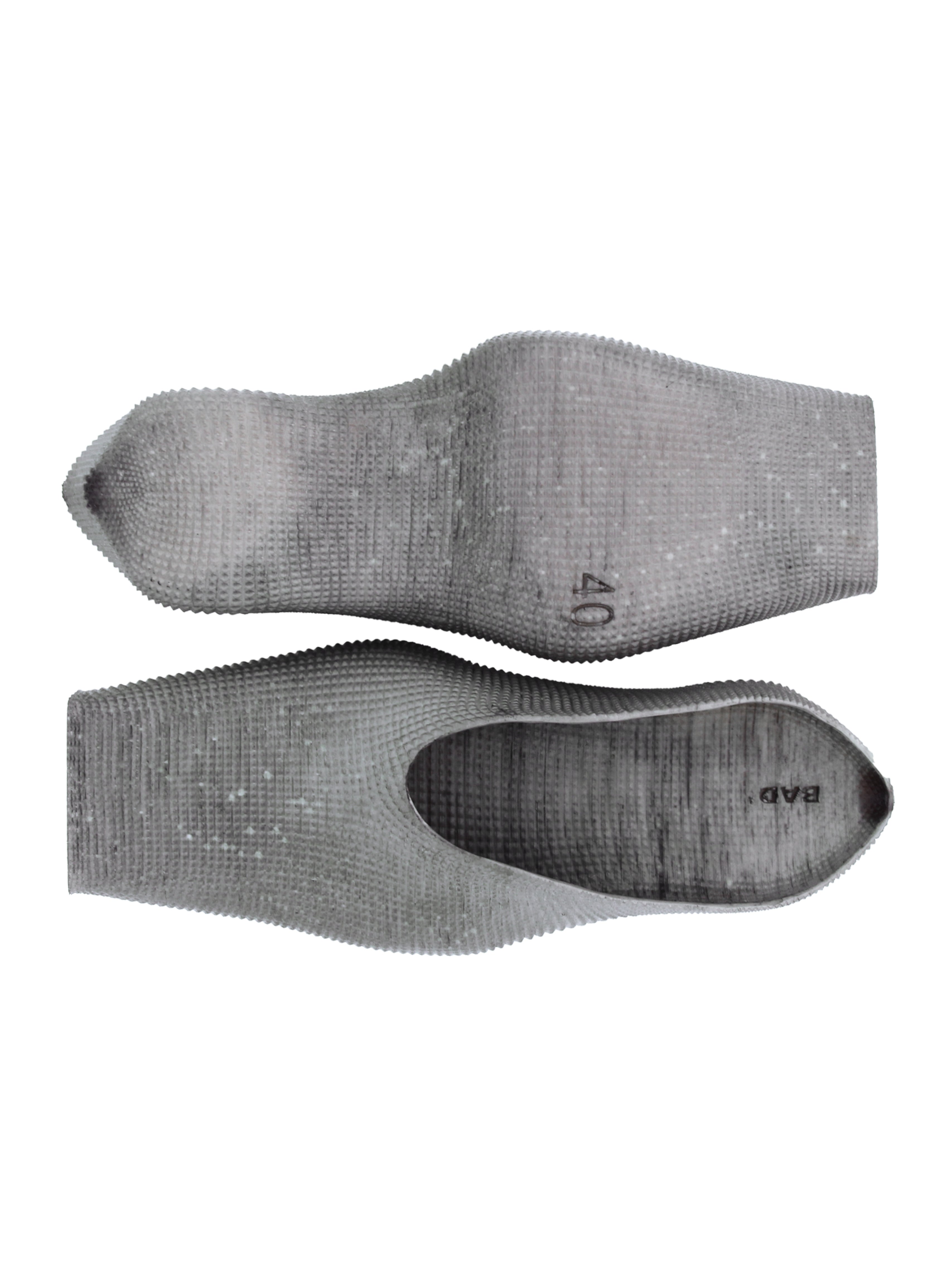 3d-printed rubber mules. These mules are crafted entirely from a fully recyclable, highly flexible polyurethane rubber. Each pair is hand-dyed using liquid dye, resulting in unique variations. Compared to traditional injection molding, 3d printing minimizes material waste while maintaining structural integrity. Minor surface imperfections are inherent to the printing process and contribute to the product’s aesthetic without affecting functionality. Due to the hand-dyeing process, some residual dye may be present initially but will fully set after the first wear.