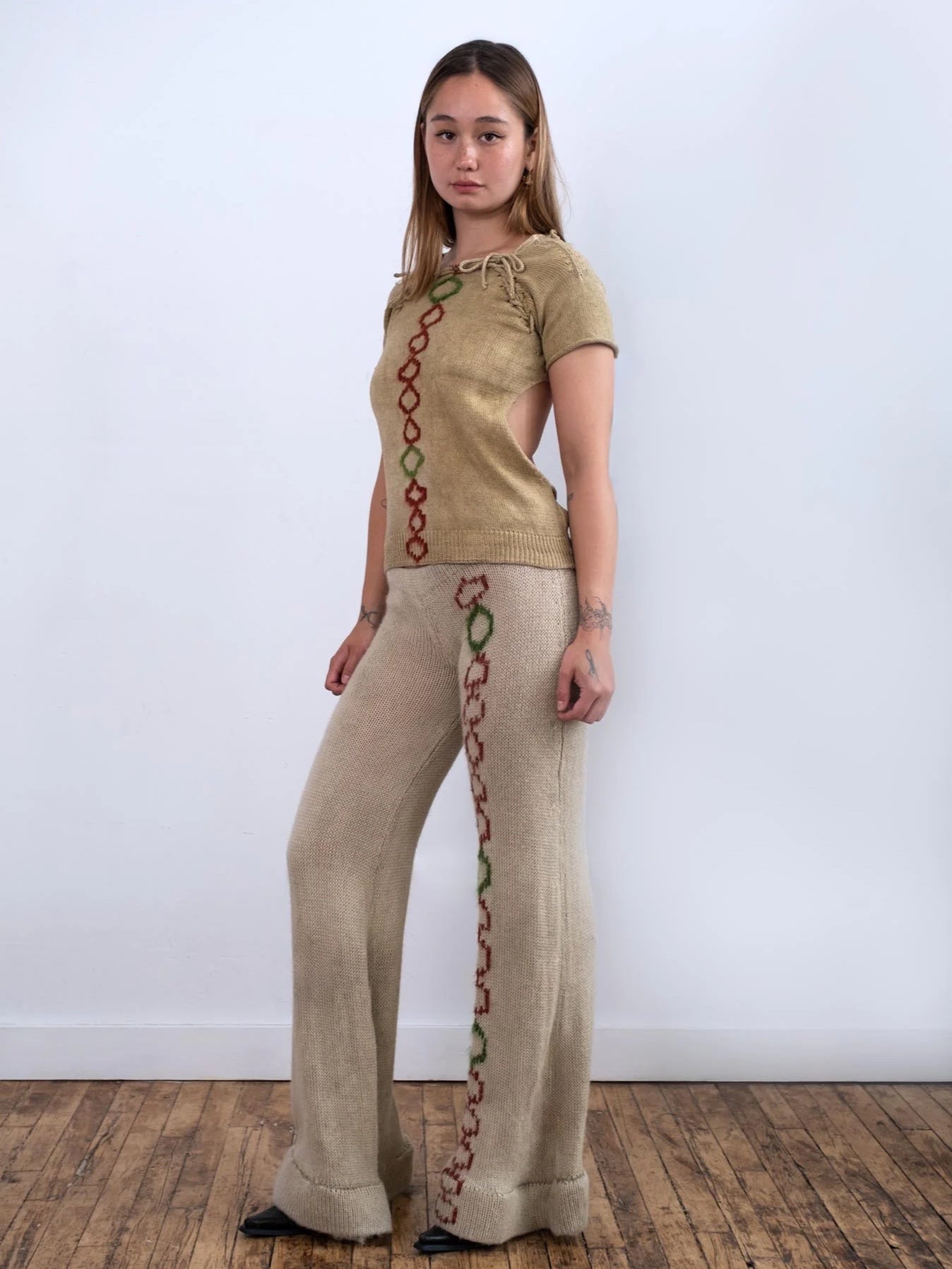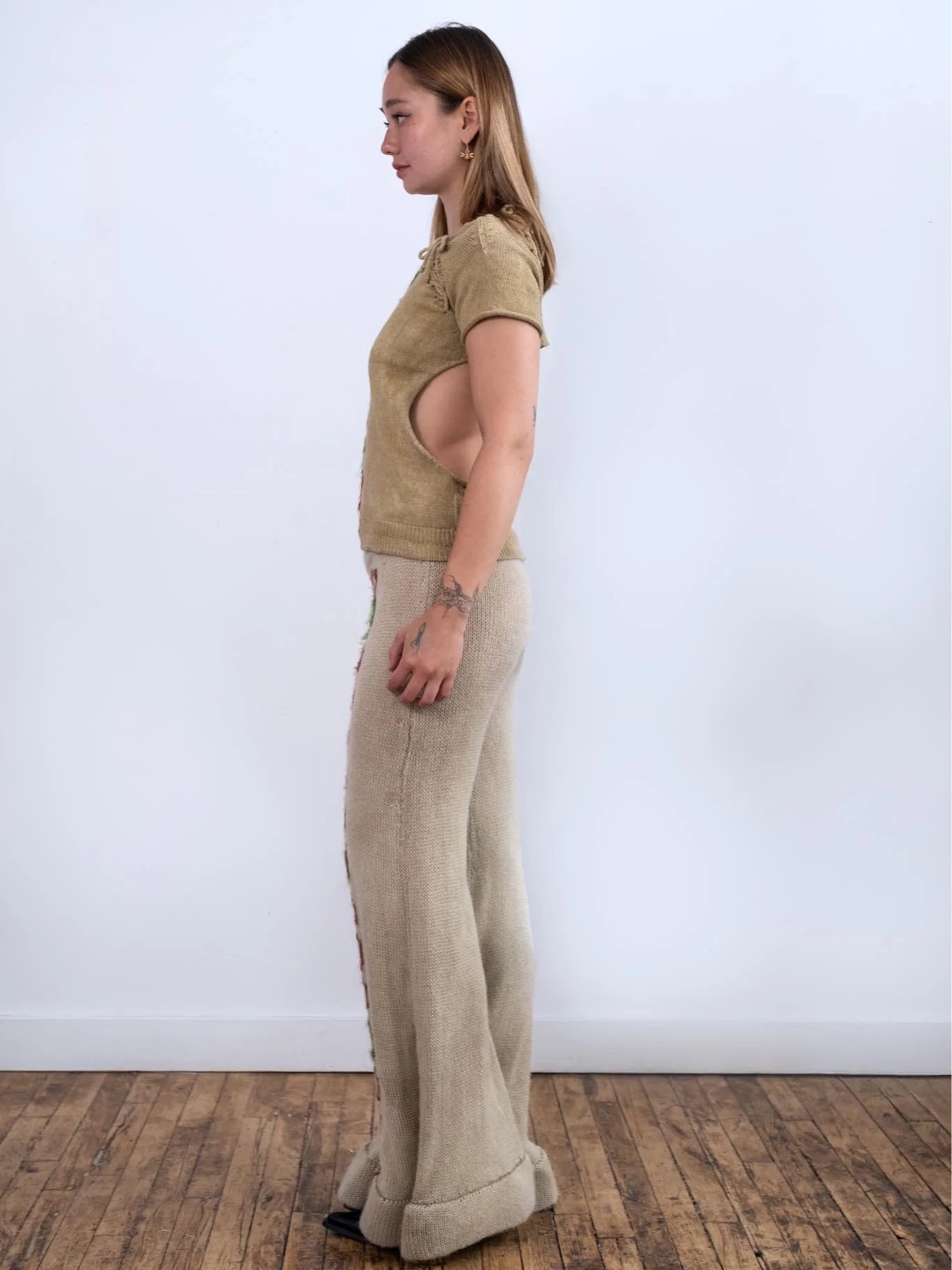 Knit from 100% cotton sourced in Lyndhurst, New Jersey, blended with a 50/50 silk–merino deadstock yarn donated from Peru and 100% alpaca sourced in New York, New York. Treatments include natural iron(III) oxide derived from the soil and natural rubber latex sourced in New York, New York. Color can be dyed differently upon request of color card after purchasing through email: graceguiknits@gmail.com. -