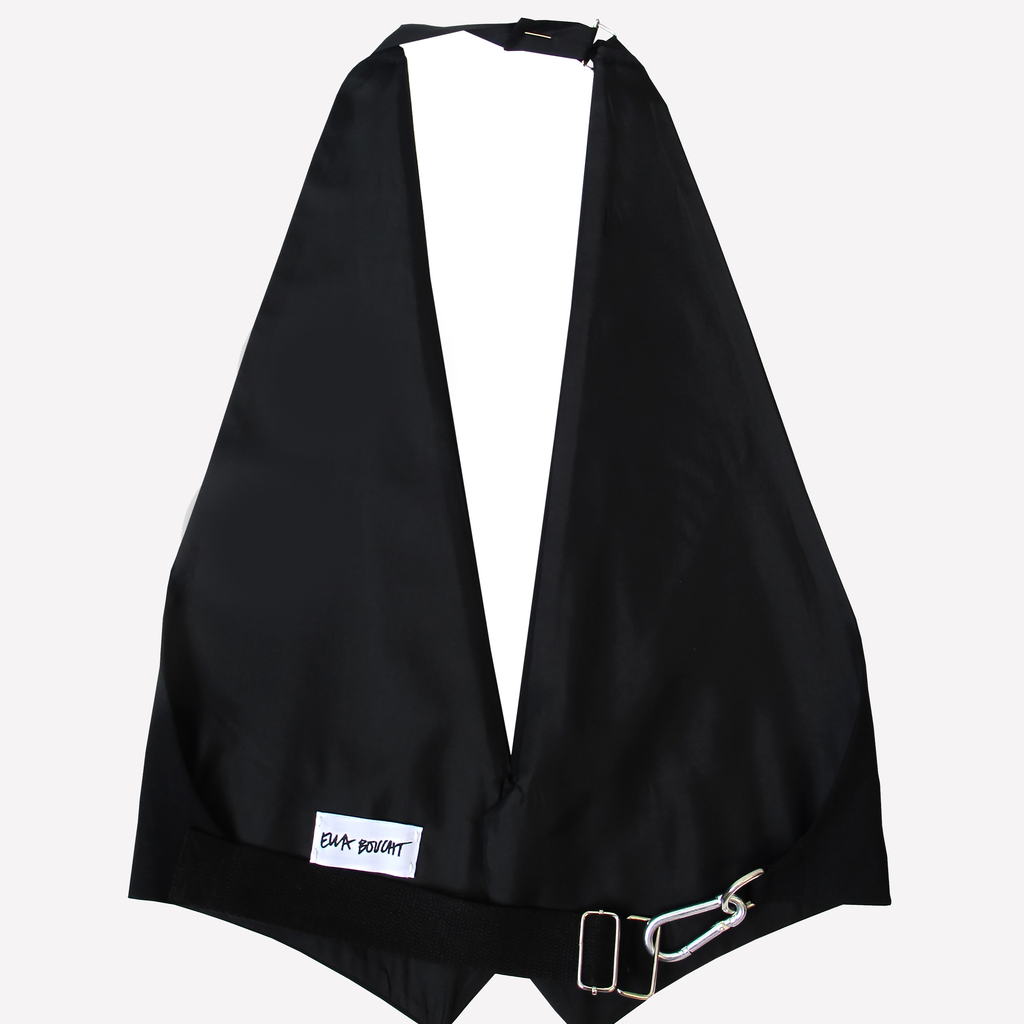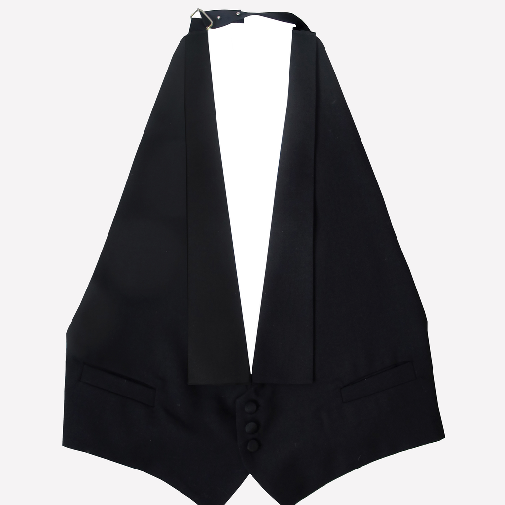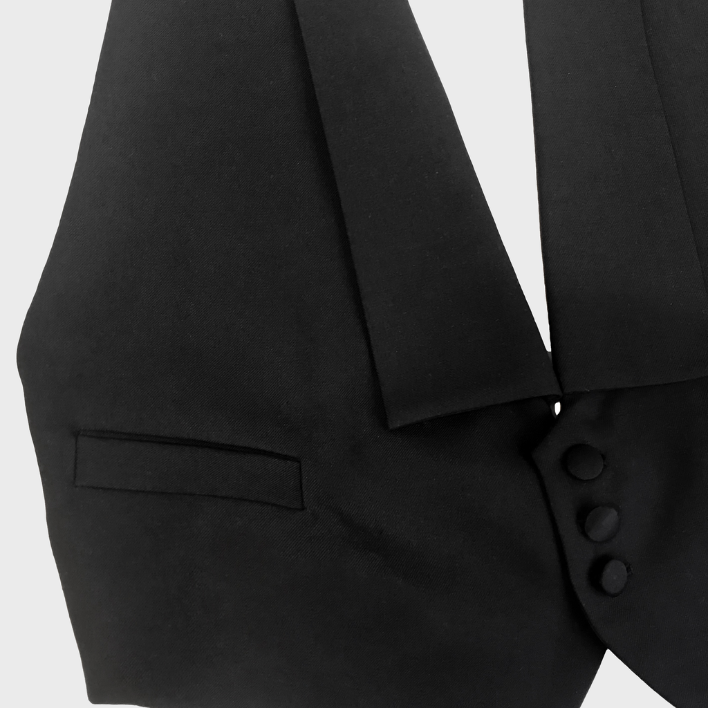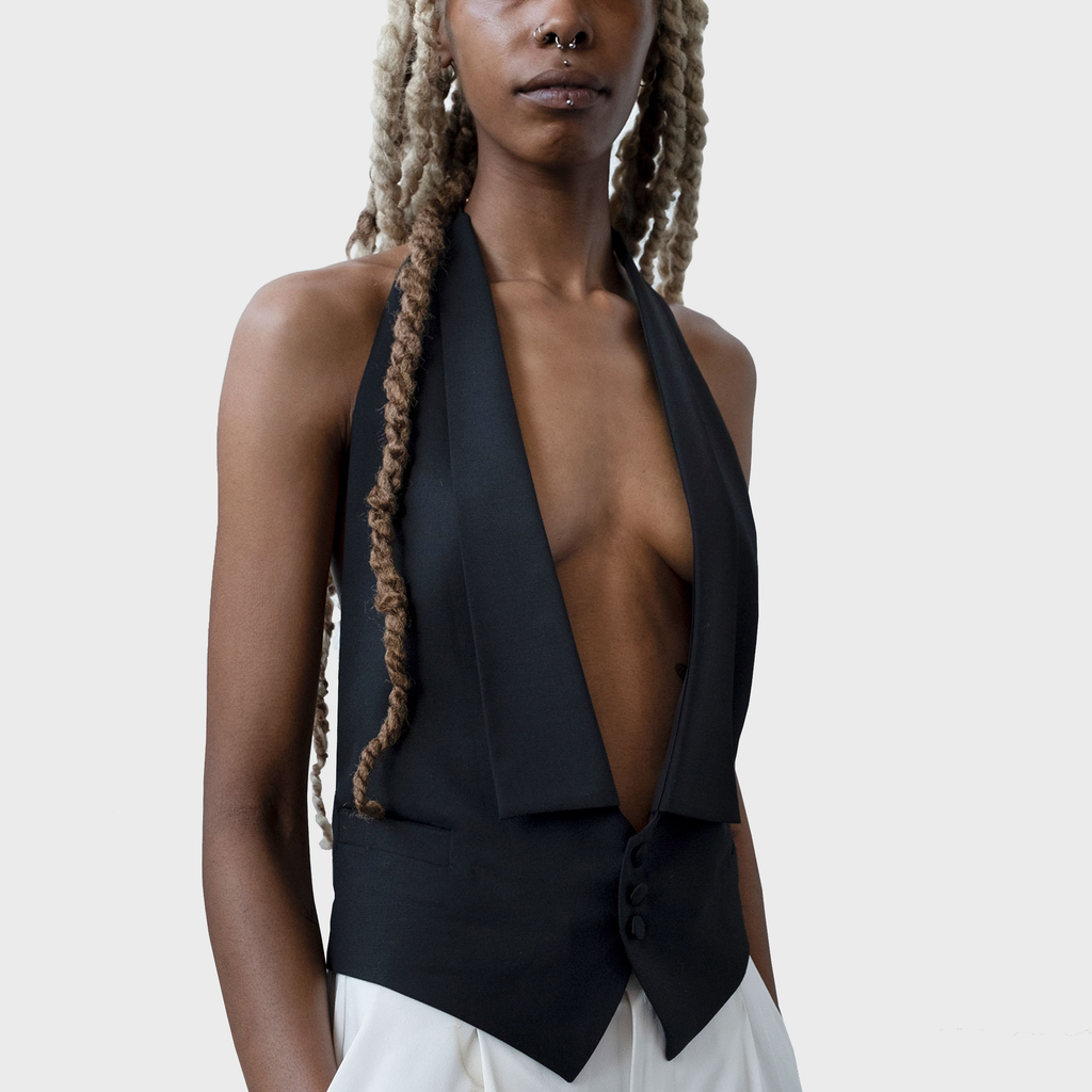 Tailored Open Back Waistcoat in black off-cut wool with two pockets and a button closure. Adjustable straps at back with up-cycled metal detailing. Handmade in England. This product is made using deadstock and up-cycled materials, therefore imperfections are expected as a sign of unique craftsmanship. Dry clean only.