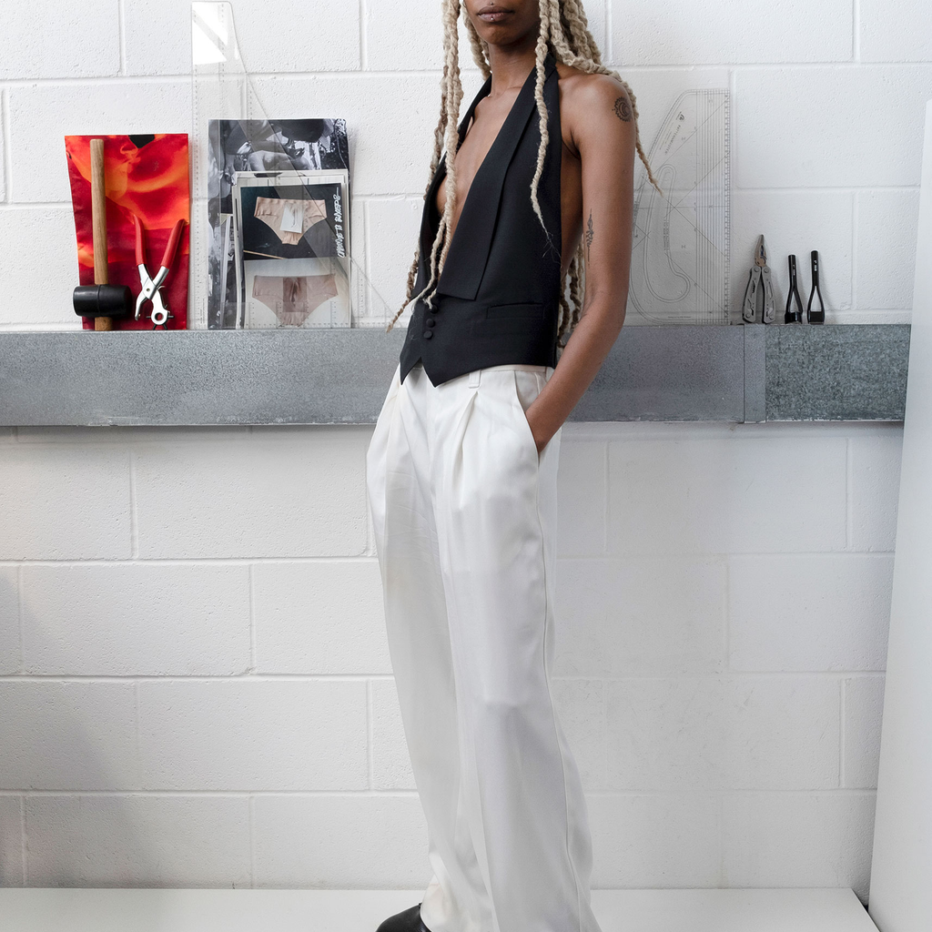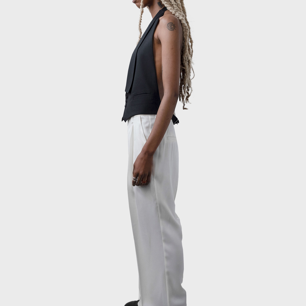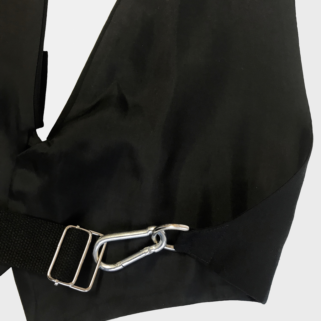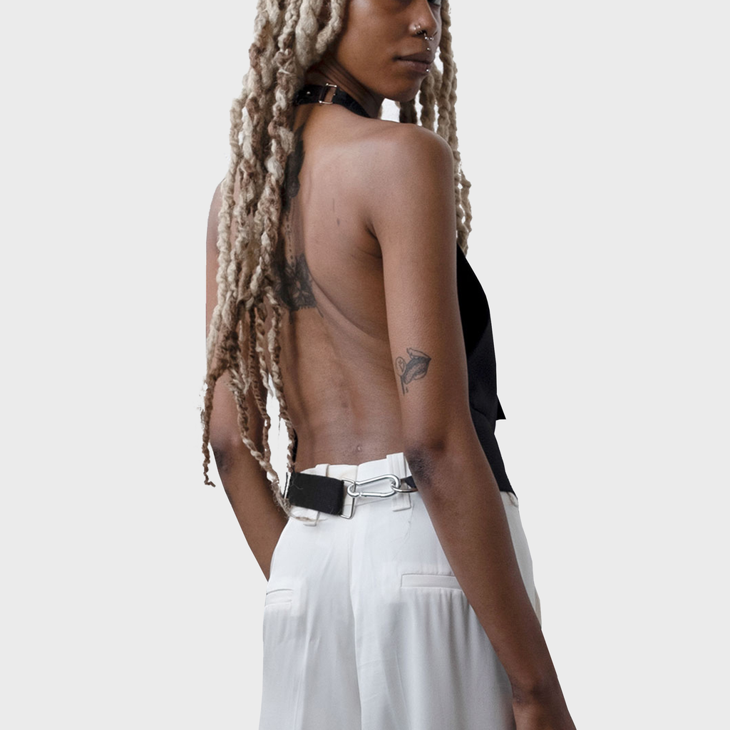 Tailored Open Back Waistcoat in black off-cut wool with two pockets and a button closure. Adjustable straps at back with up-cycled metal detailing. Handmade in England. This product is made using deadstock and up-cycled materials, therefore imperfections are expected as a sign of unique craftsmanship. Dry clean only.