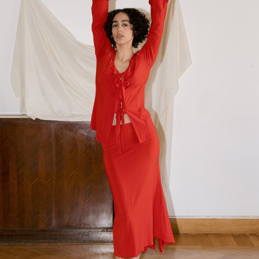 Fitted around the bodice and more loose around the arms. Fabrics used are all remnants jerseys from the 90s adding a rare soft feel to the top.