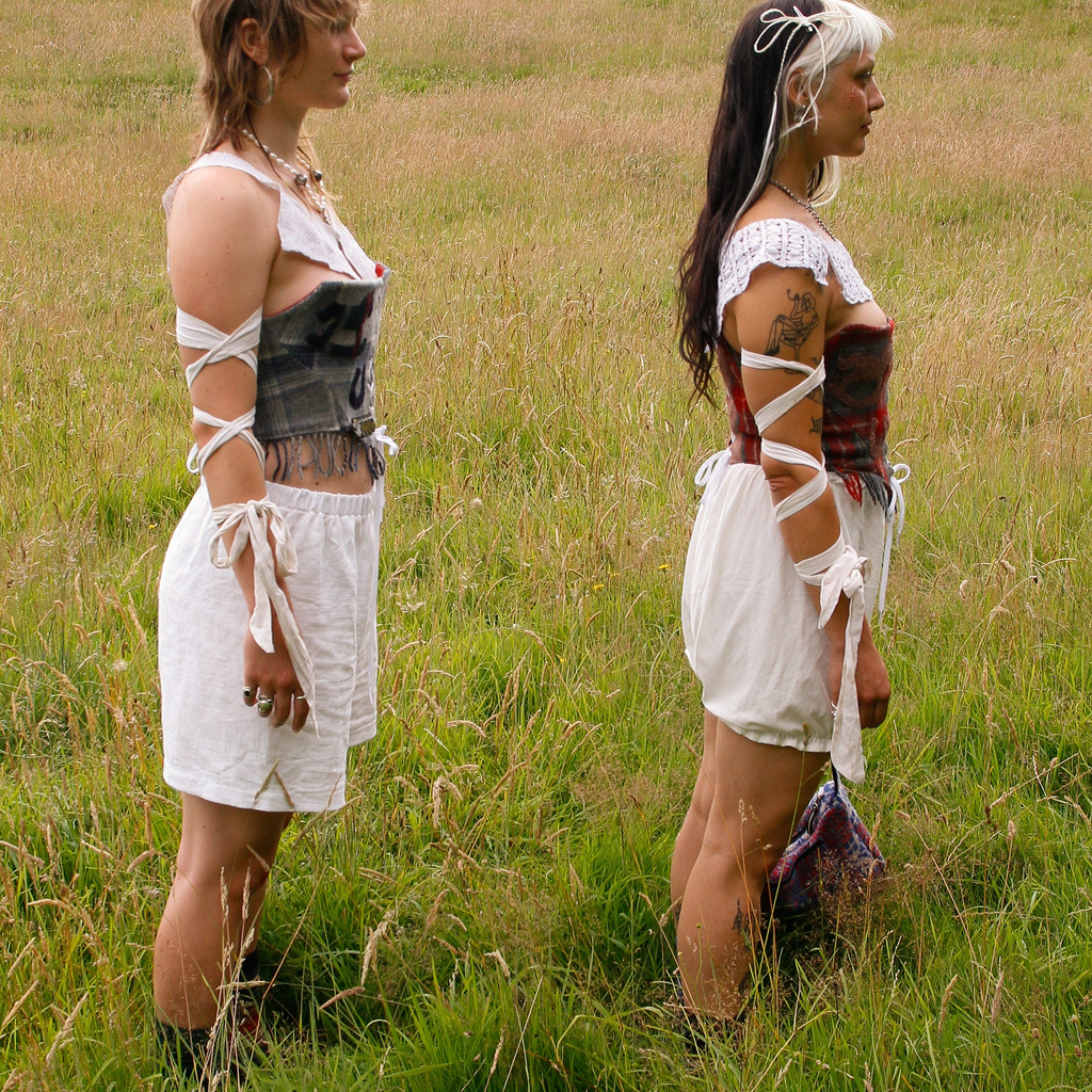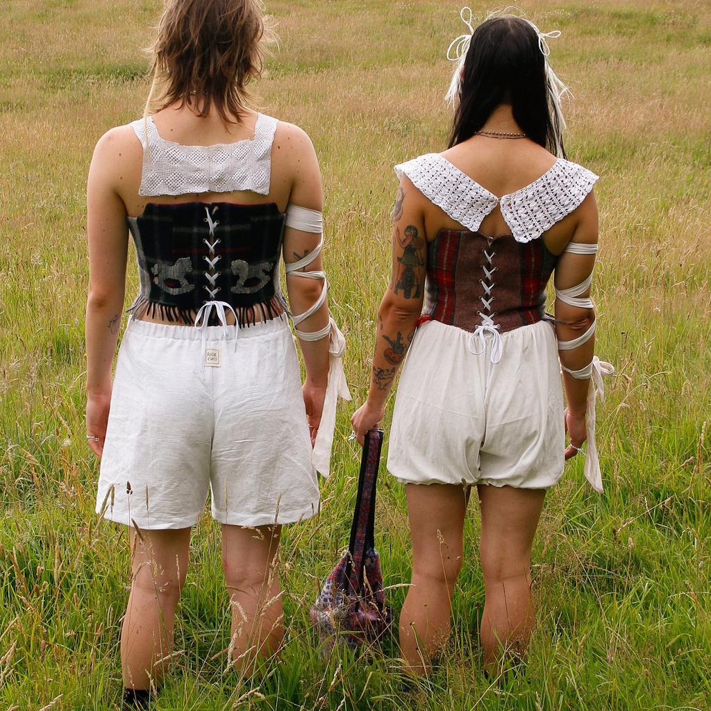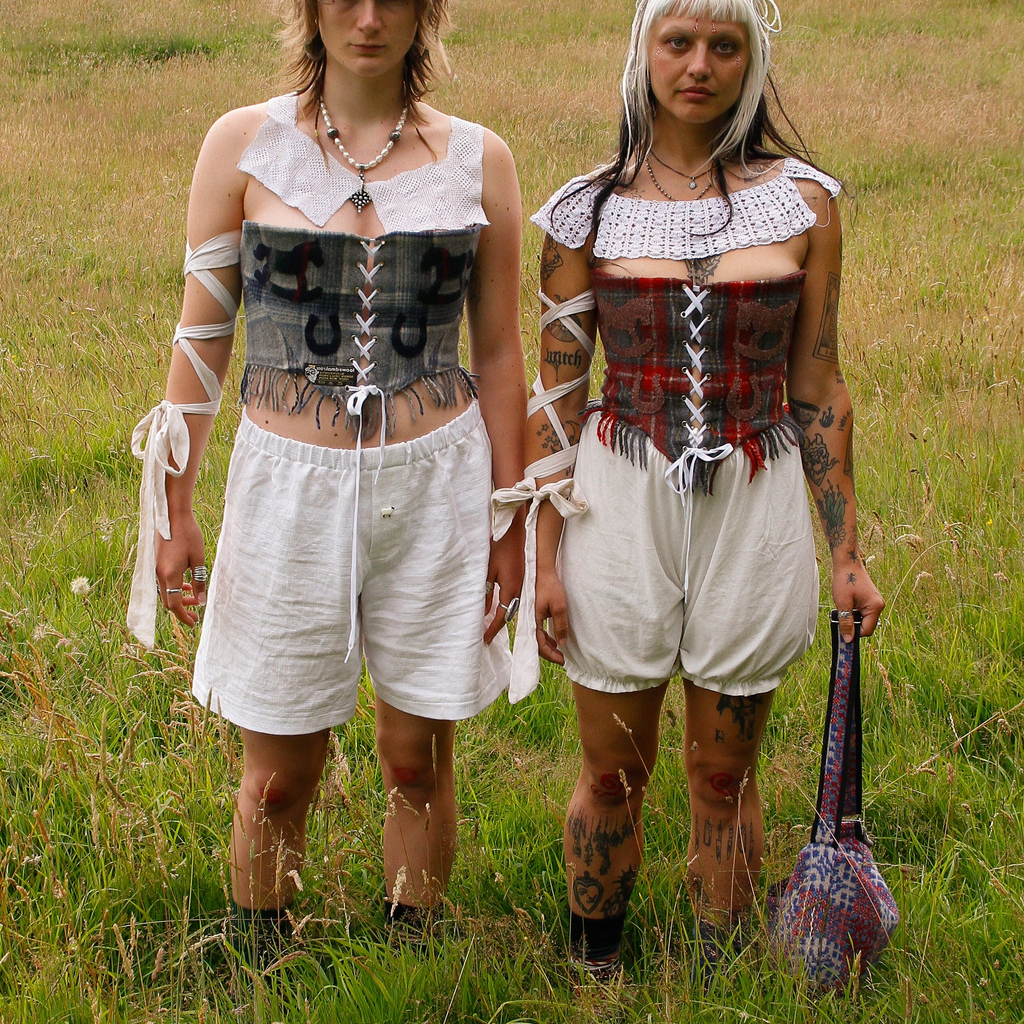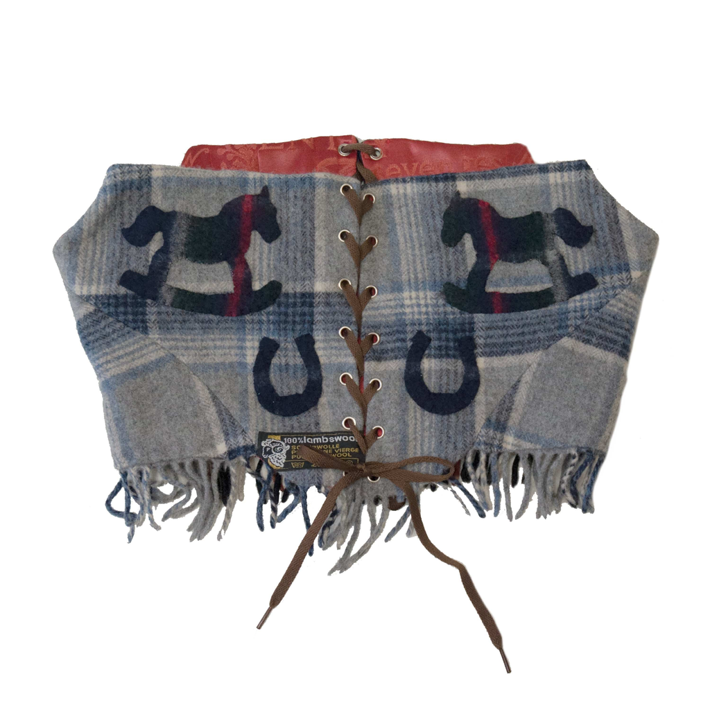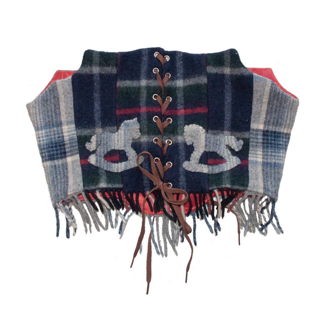 Strapless corset made from vintage shrunken and damaged wool scarves. Features hand-appliquéd rocking horse and hobby horse patches. Structured with upcycled plastic packaging boning and laces at the front and back. Lined with deadstock cotton sateen.