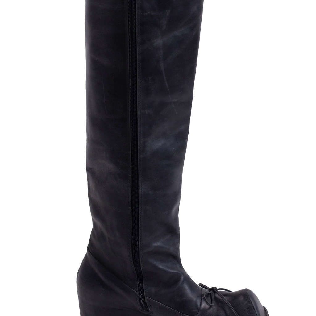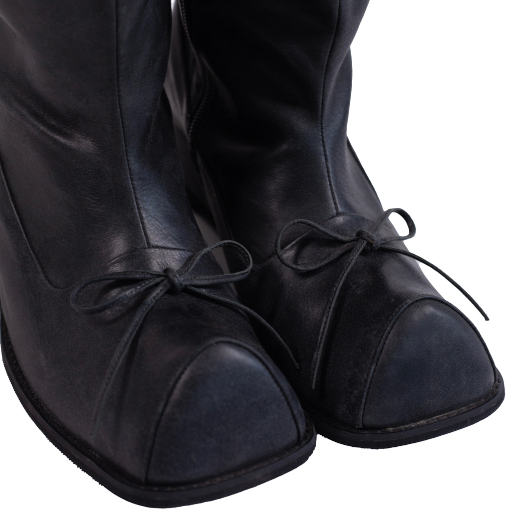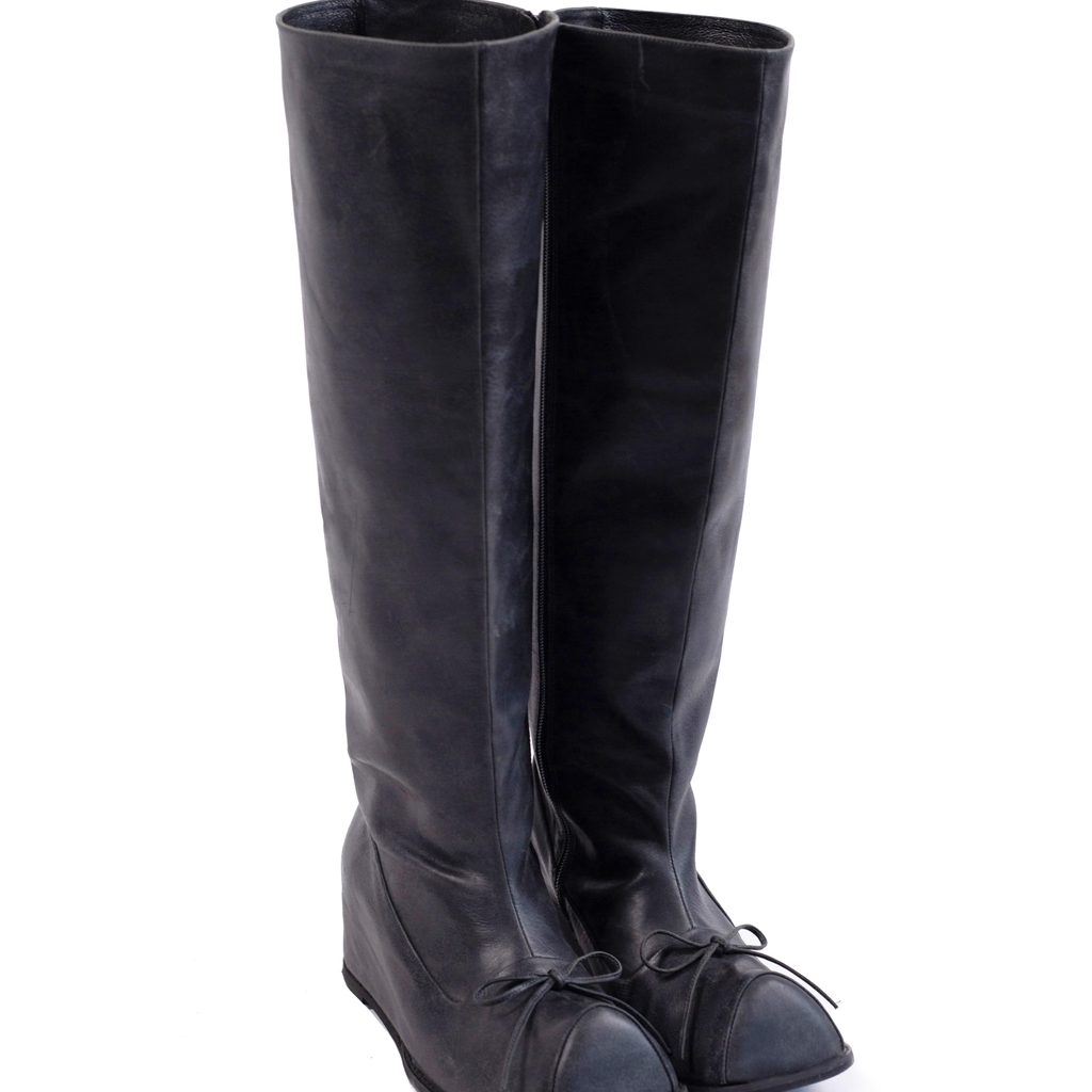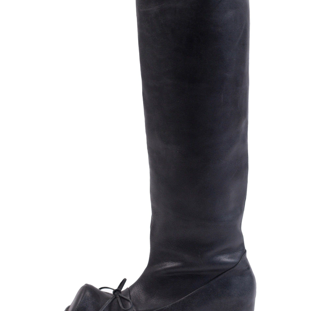 HOFA boots made in a thick 'crazy horse' leather. Square toe, covered wedge heel. Leather bow. Handcrafted in Lithuania.