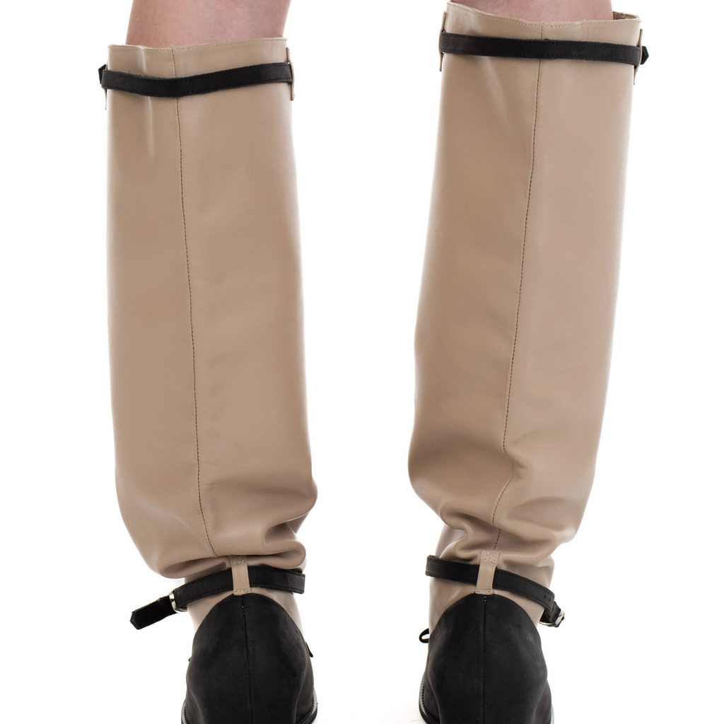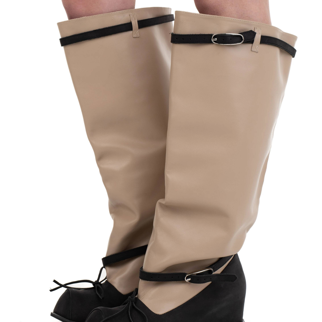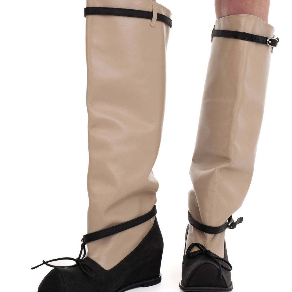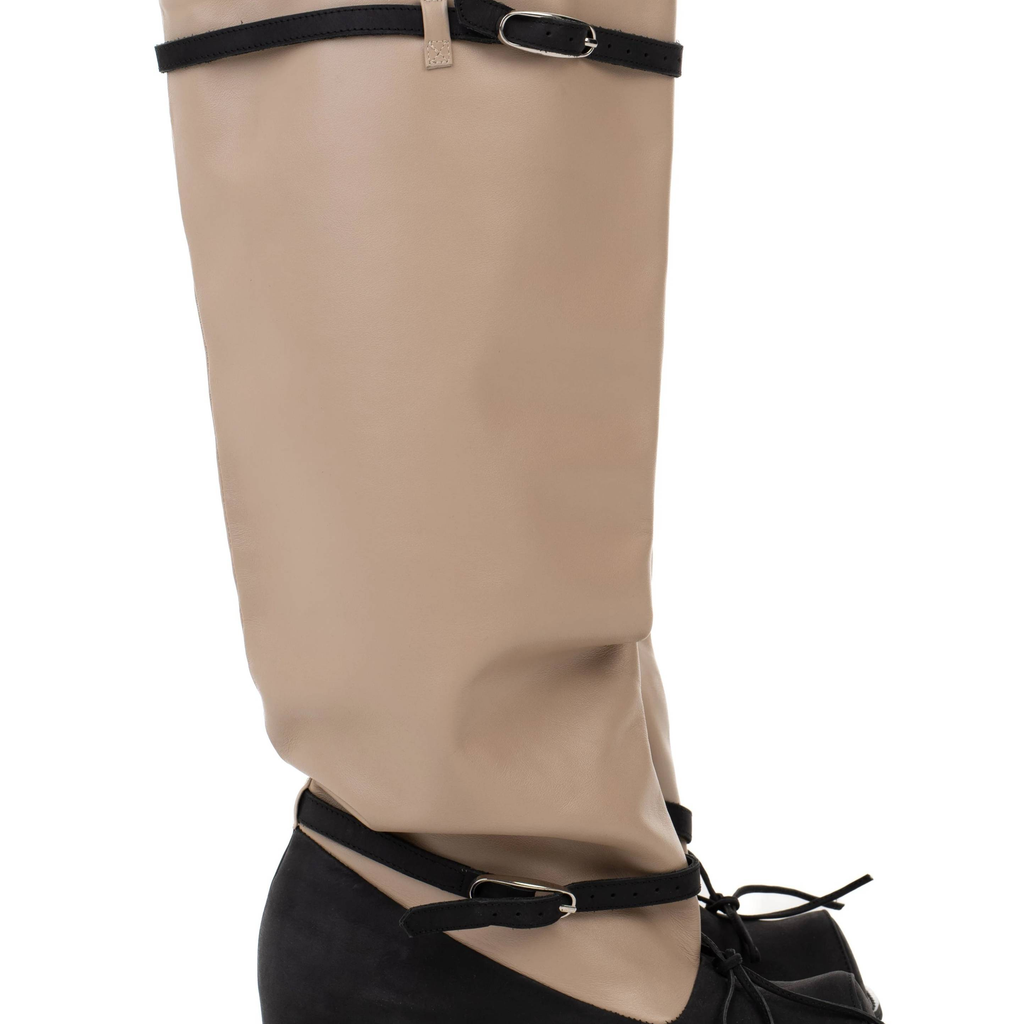 Hofa boots in Beige, leather construction, knee-high, adjustable pin-buckle strapdetailing, squared toe, self-tie detailing, wedge heel, rubber sole. Can by styled and foldedin different ways. Square toe. Covered wedge heel with rubber injection. Rubber sole. 100% genuine leather lining. Rubber sole