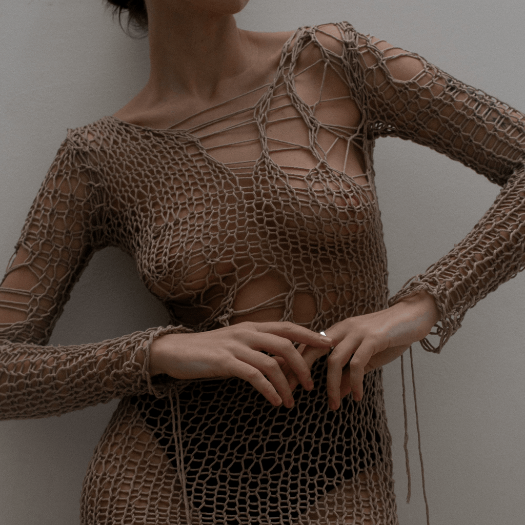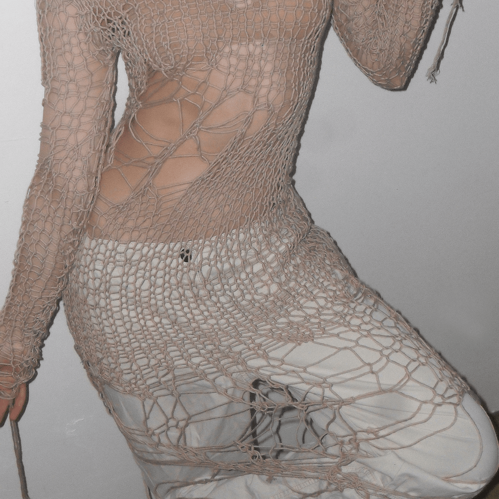This dress is knitted by the designer of the brand herself, as one of the most difficult patterns from the whole collection.To add more destructive look for this item V4K manually add threads for details, and to make it strong and durable.