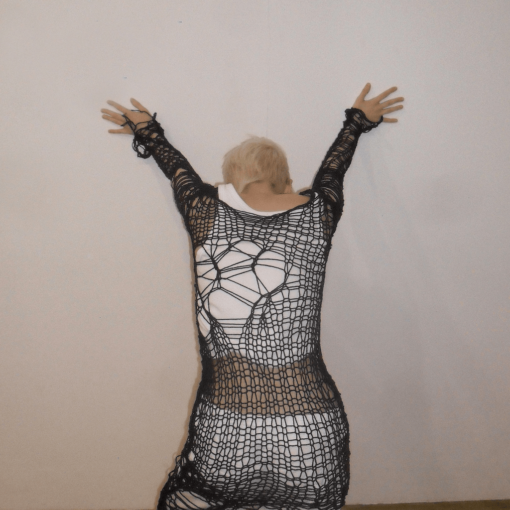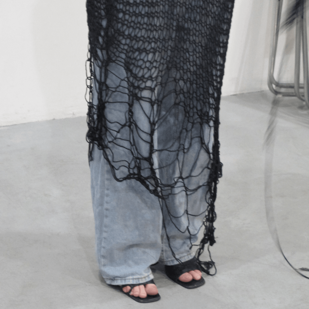 This dress is knitted by the designer of the brand herself, as one of the most difficult patterns from the whole collection.To add more destructive look for this item V4K manually add threads for details, and to make it strong and durable.