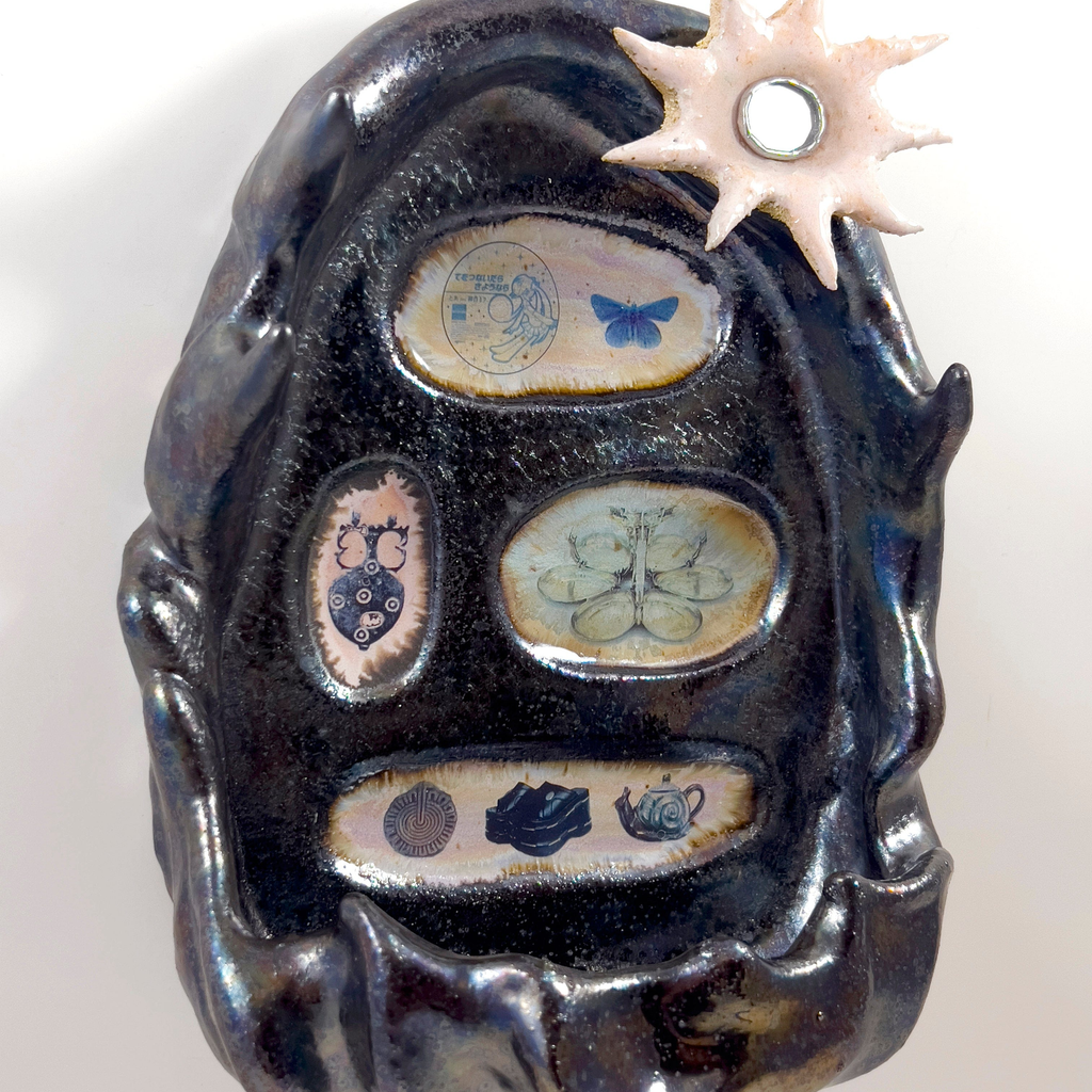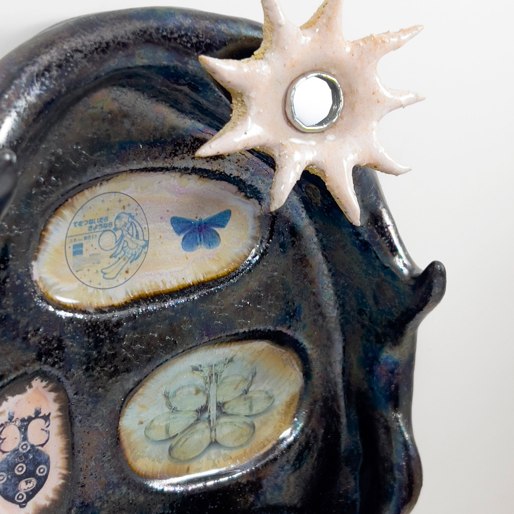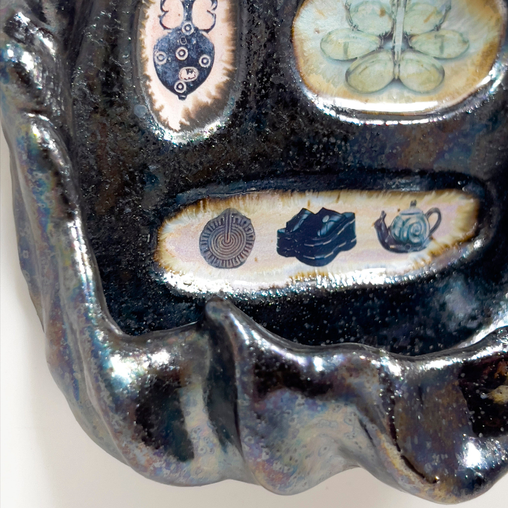 Materials: Stoneware, glaze ceramic decals, mirror, solder, resin