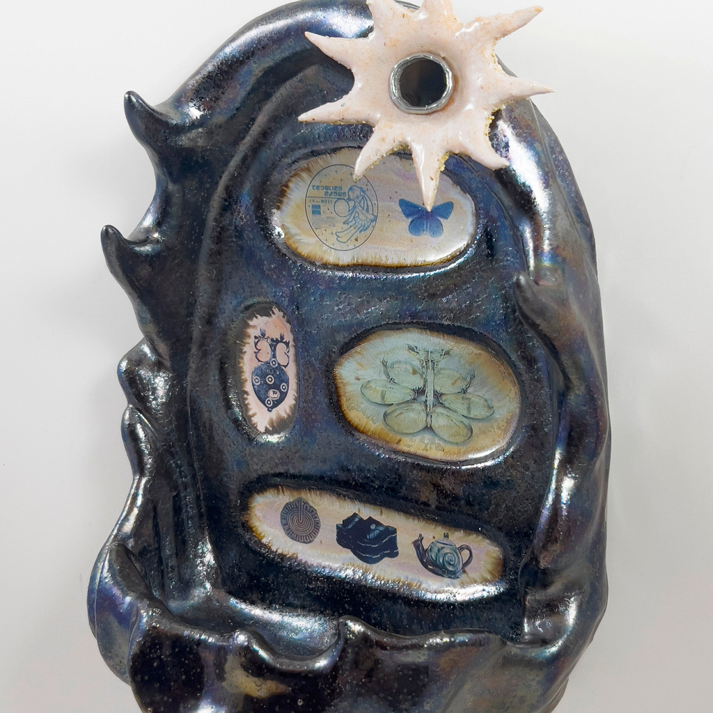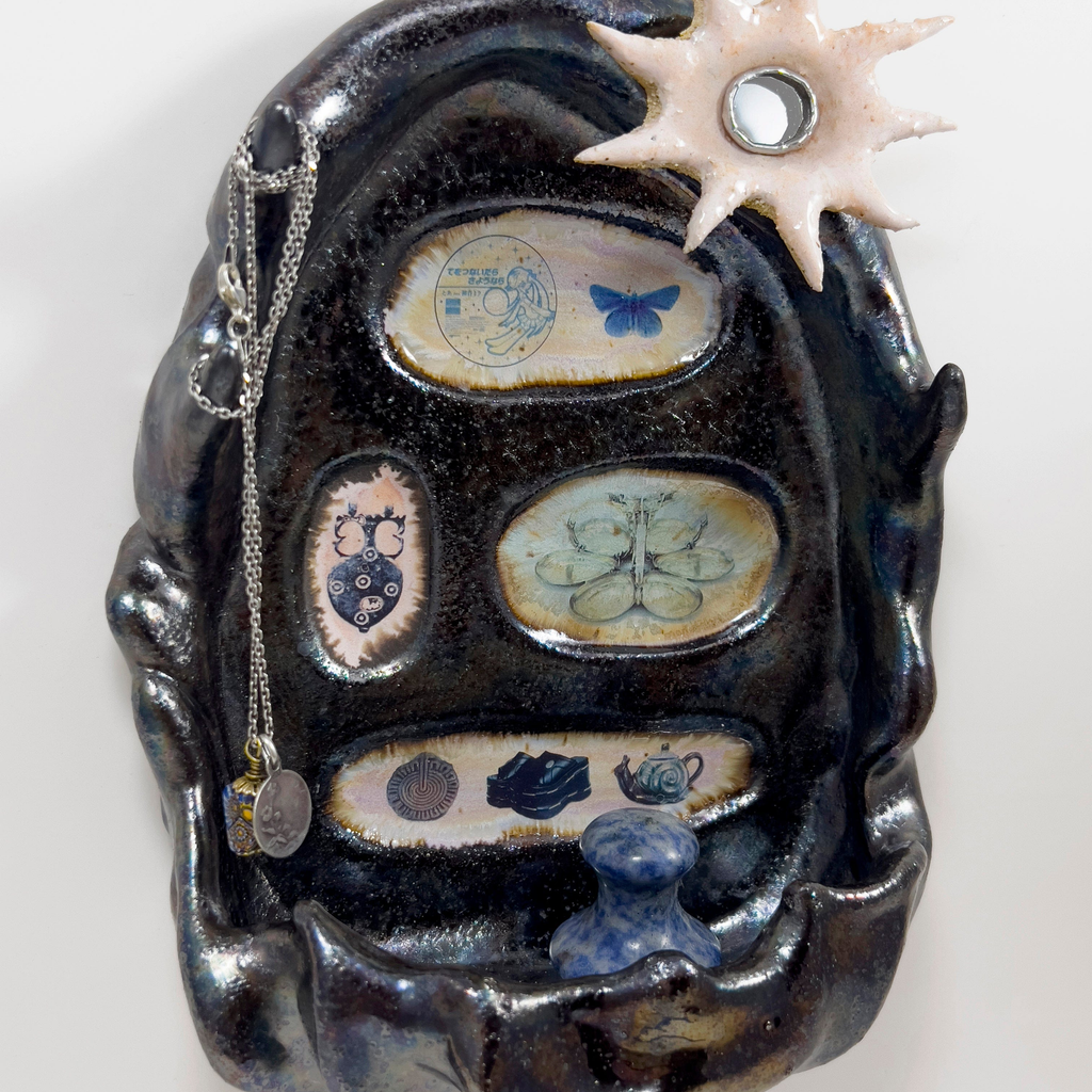 Hand sculpted, wall-mounted ceramic shelf to hold jewelry or small things. Features a textured holographic finish with ceramic decals of found Internet imagery. Hanging hardware included.