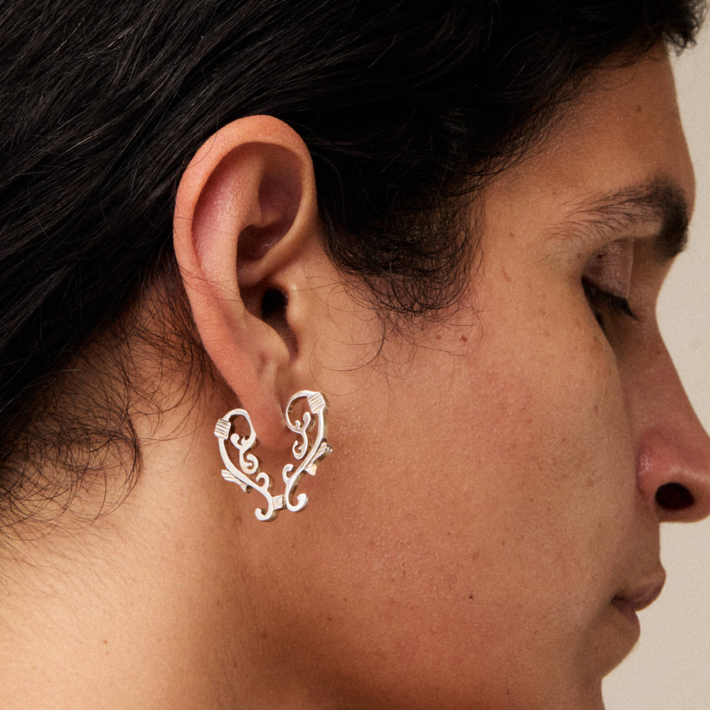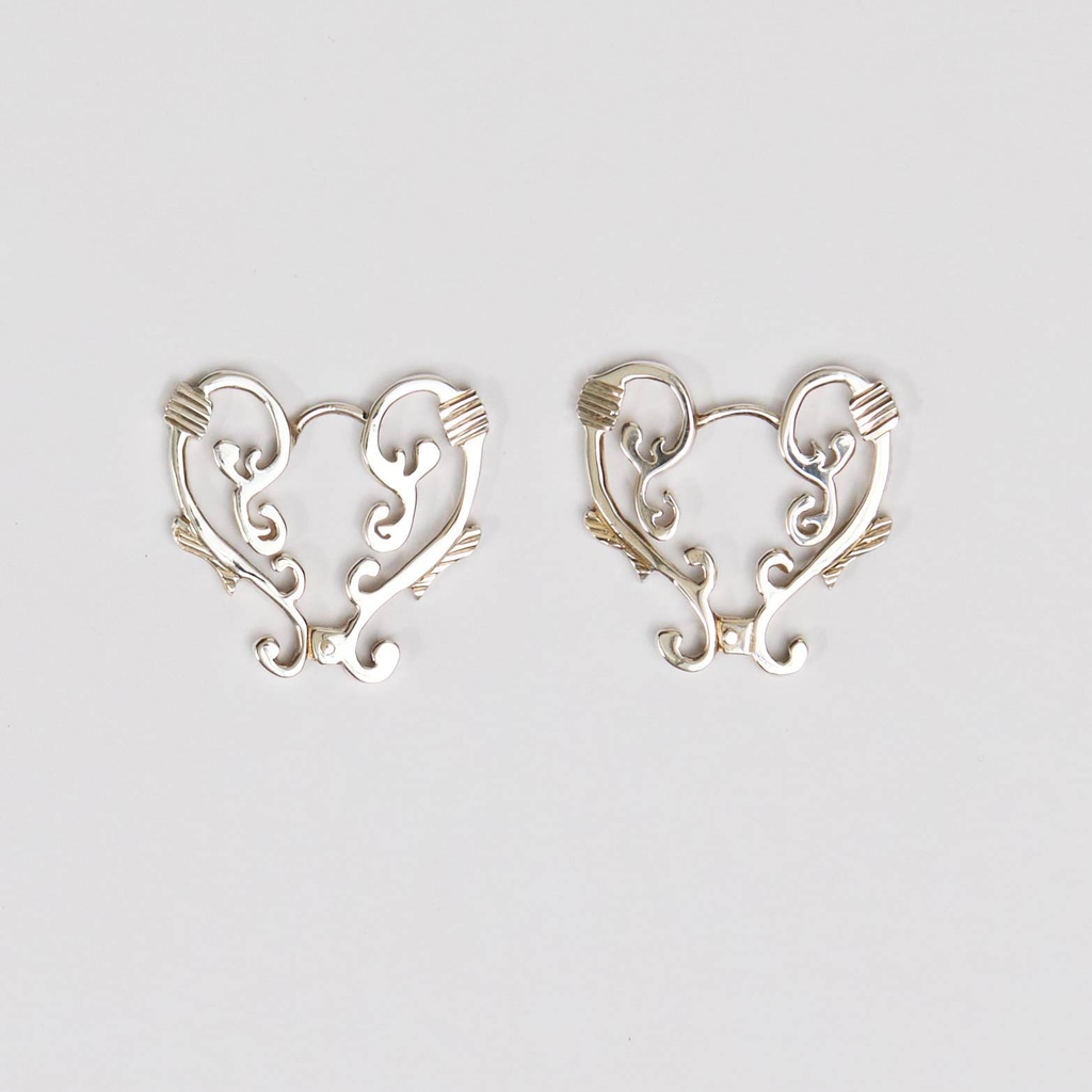 The Holy Heartbreakers are a poetic evolution of the classic heart motif, a symbol seen across cultures and reimagined as part of our identity. This design, inspired by the flowing curves of wrought iron gates and the settings of our everyday surroundings, features a heart meticulously formed from pure silver. Tiny silver strands reach inward, resembling the natural overgrowth of a garden—a balance of elegance and untamed beauty. To wear the earrings, the heart must be opened at its hinge, an act that mirrors the sentiment of breaking a heart.