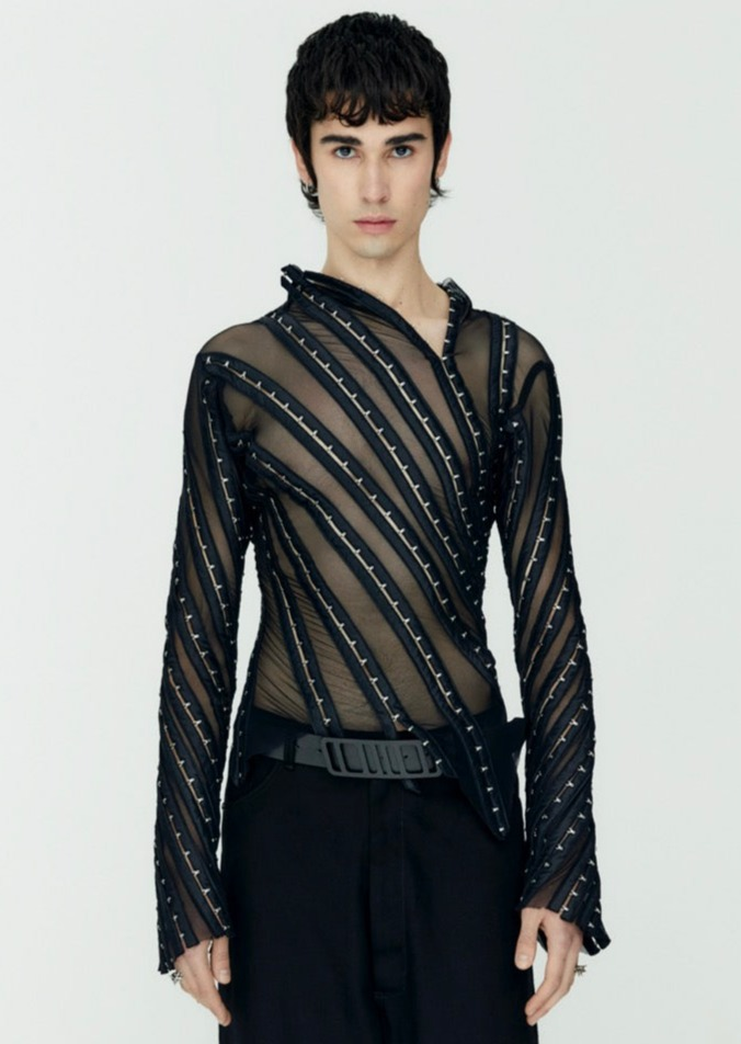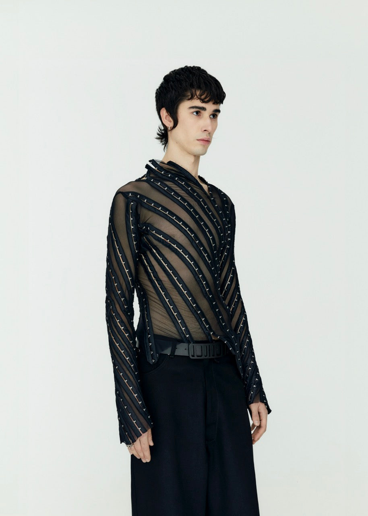 ONRUSHW23FH, a Spanish experimental design brand founded in September 2020 by Albert Sánchez and Sebastian Cameras. Sánchez and Cameras initiate their design journey with a curated amalgamation of influences—movies, images, words, sounds—that coalesce into a substantial mood board. At the core of the duo's creative process lies a seamless integration of digital craftsmanship. 3D prototypes, initially draped over mannequins like canvases, undergo a transformative journey of modification and distortion.