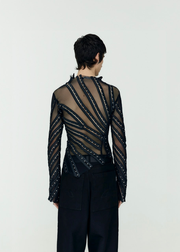 Signature mesh top with statement Hook & Eye opening detail throughout. Engineered to be seamless at sides, shoulders, neck and sleeves. Made in soft-to-touch 4-way stretch mesh, comfortable against the skin. Hook & Eye tapes can be opened at any point around the body for maximum comfort.