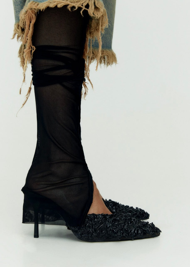 SS23 mesh warmers with hook and eye strap opening. Slightly flared to base.