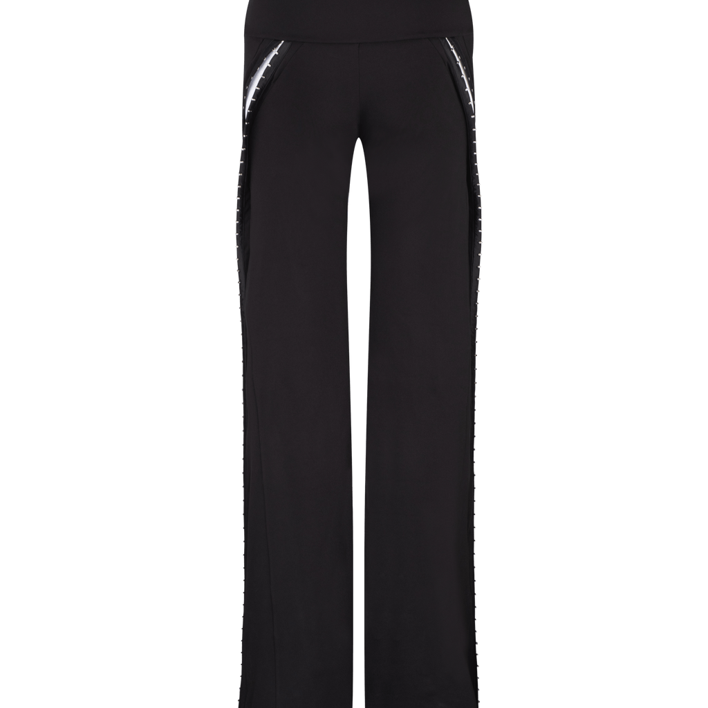 Front hook and eye closure, that can be worn between high rise and low rise. White panel underneath. Side hook and eye detailing. Pants can be worn shorter by moving hook and eyes around.