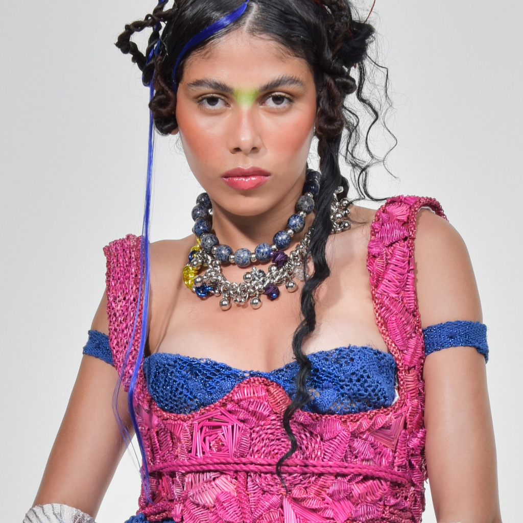 Embroidered corset in Colonião grass, handmade in partnership with master artisan Juão de Fibra.