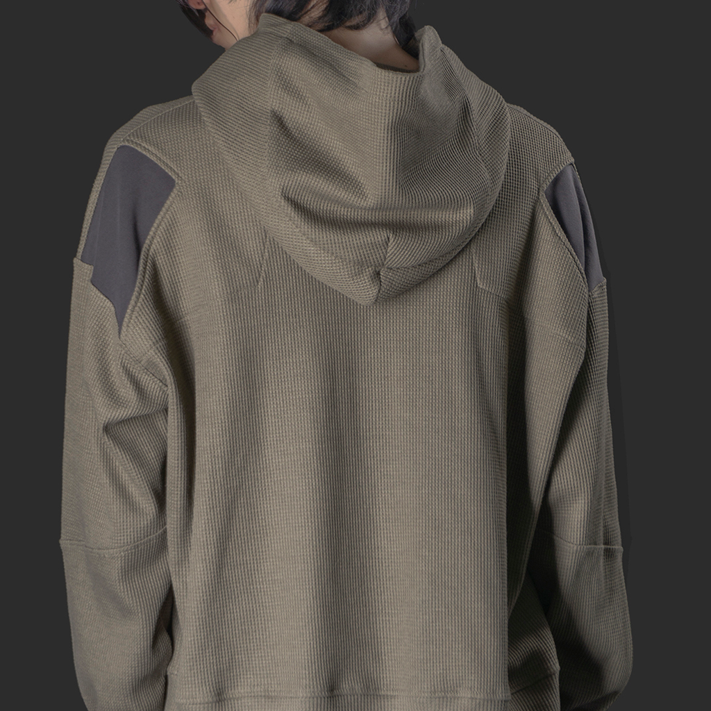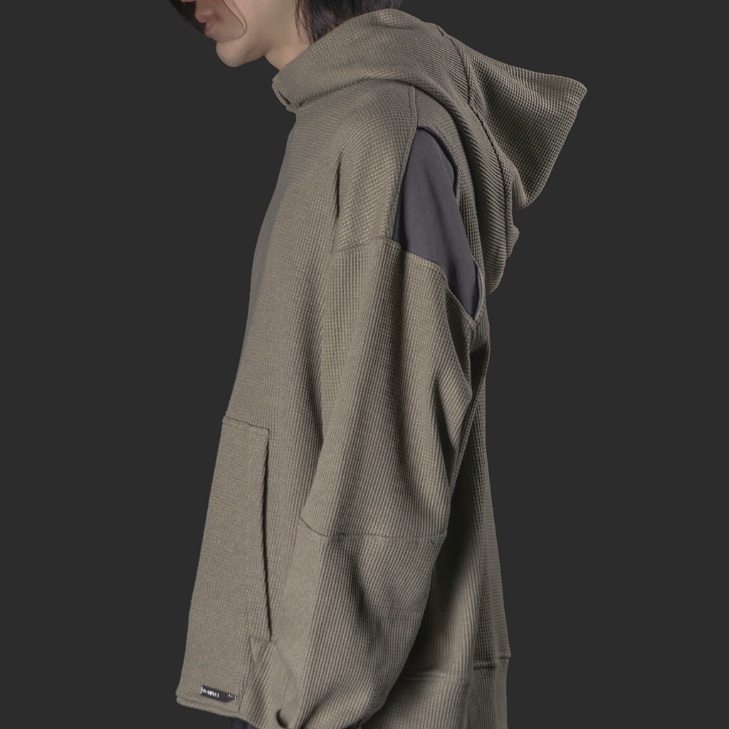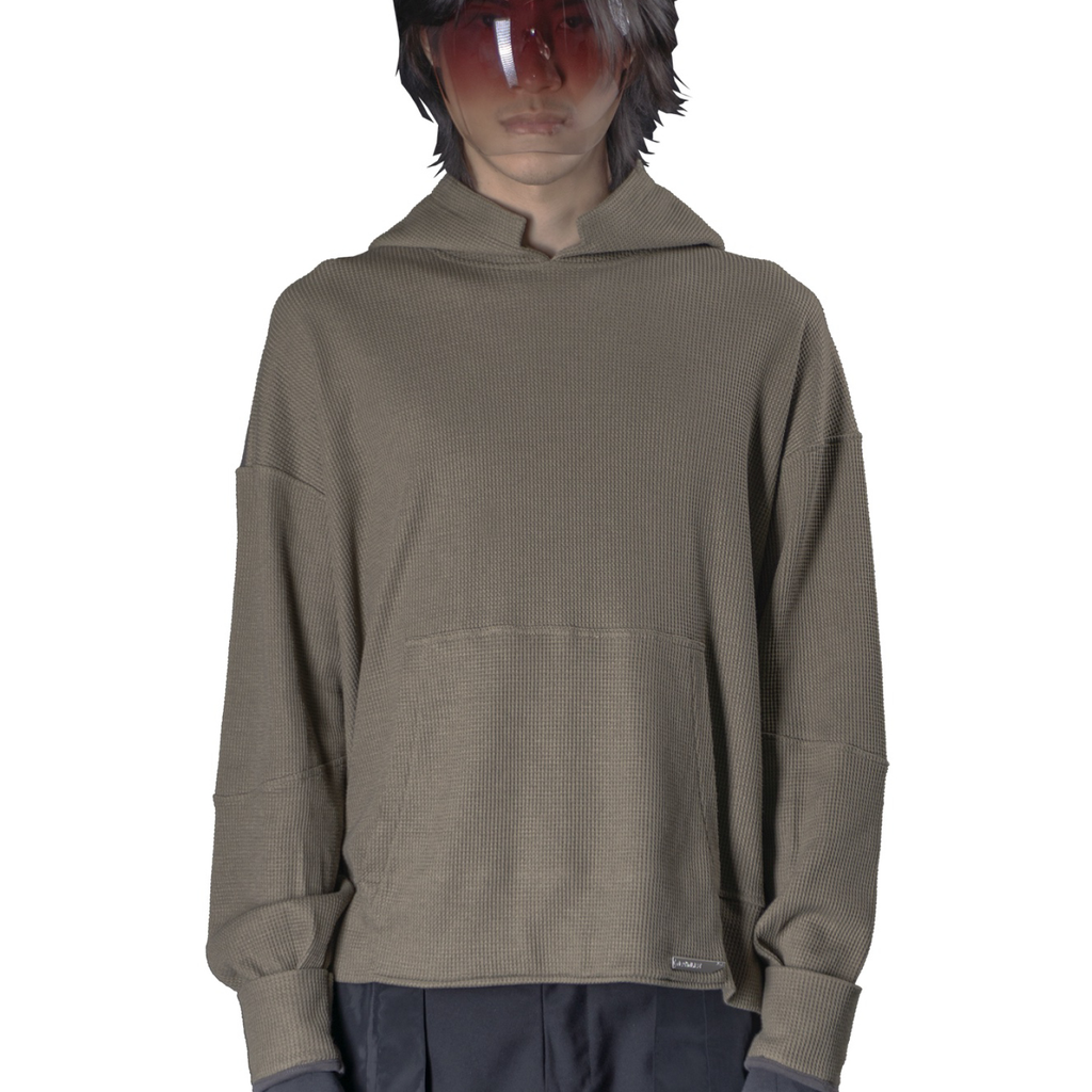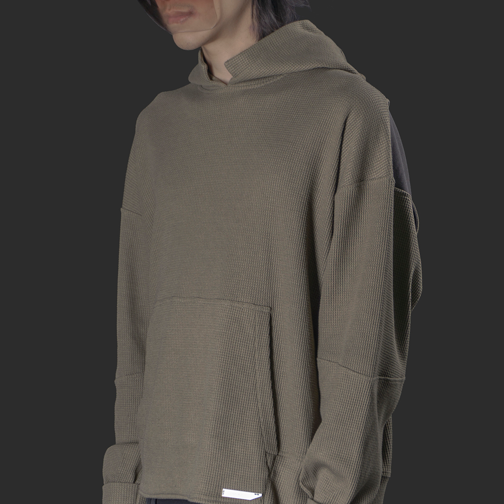 Long sleeve Waffle-knit hoodie in tiffany grey. Custom zinc metal label at front kangaroo pocket. Arrow-hooded collar. Dropped shoulder. Flipped cuffs.
